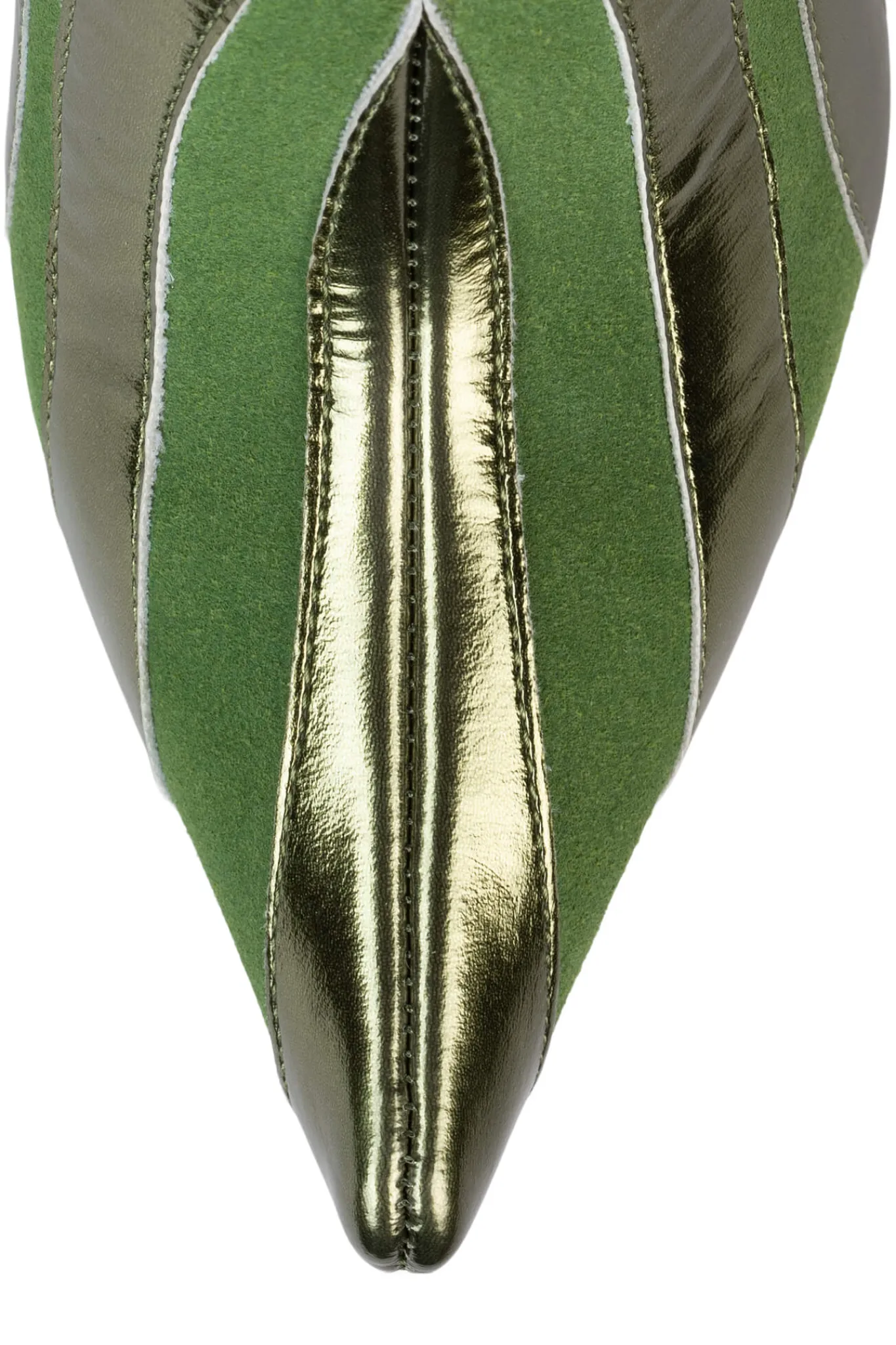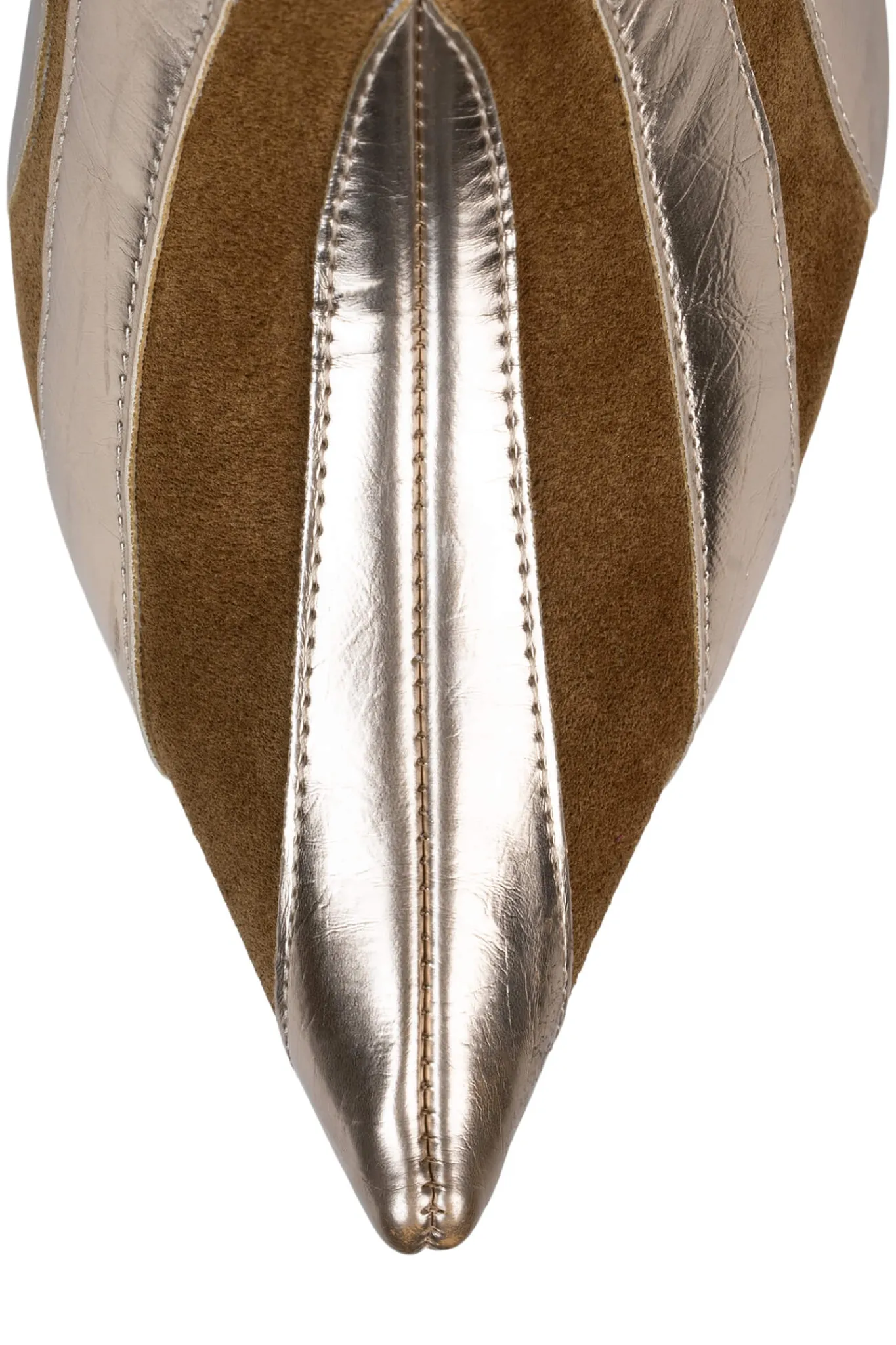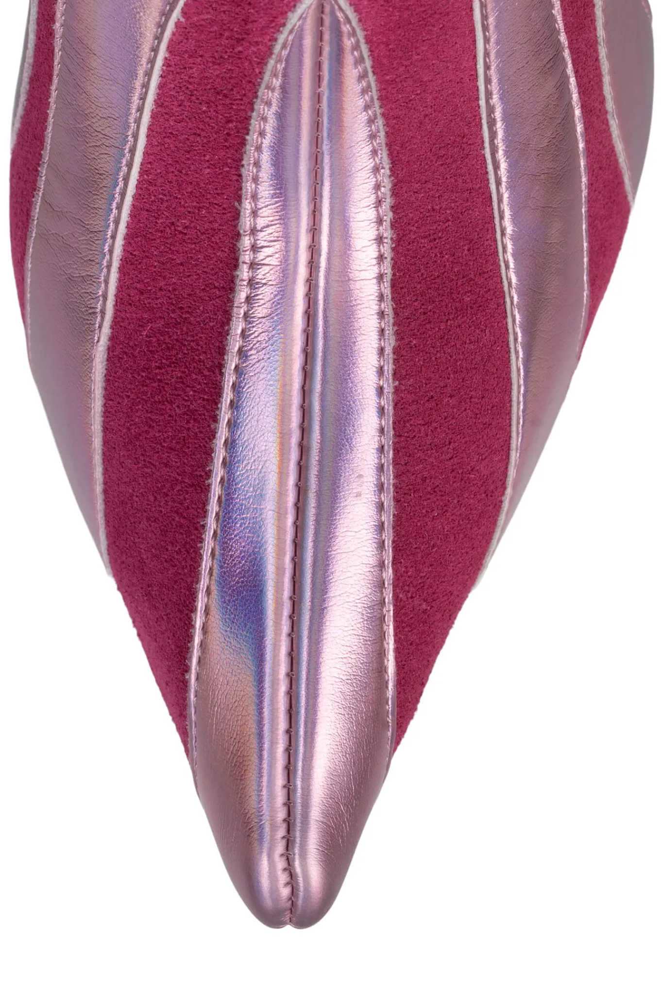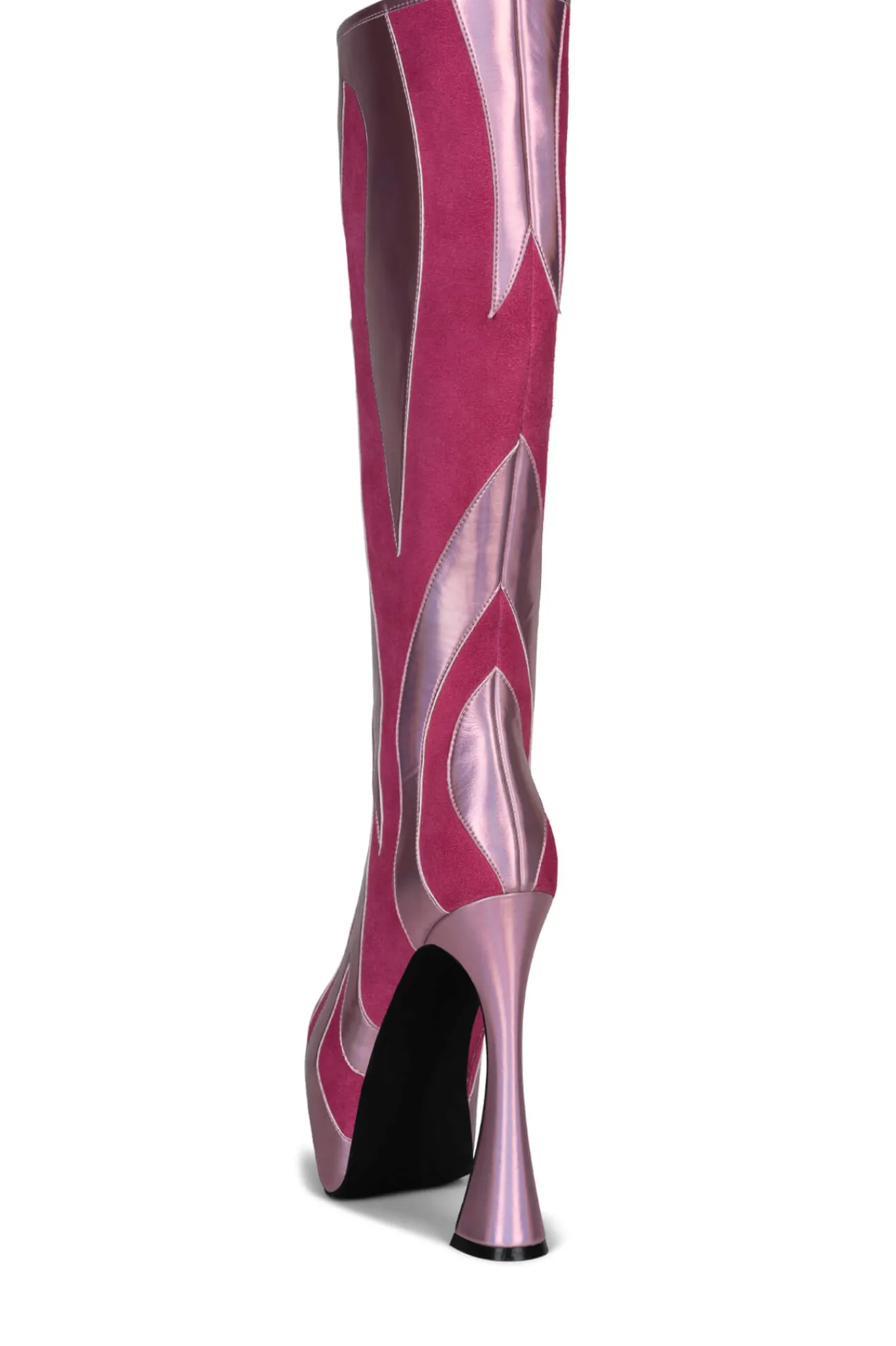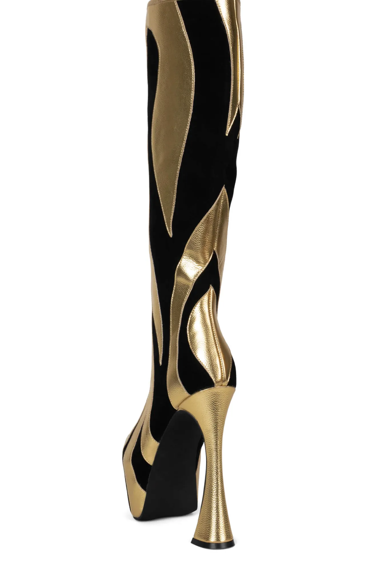 Exaggerated pointed-toe knee-high platform boot with trumpet heel