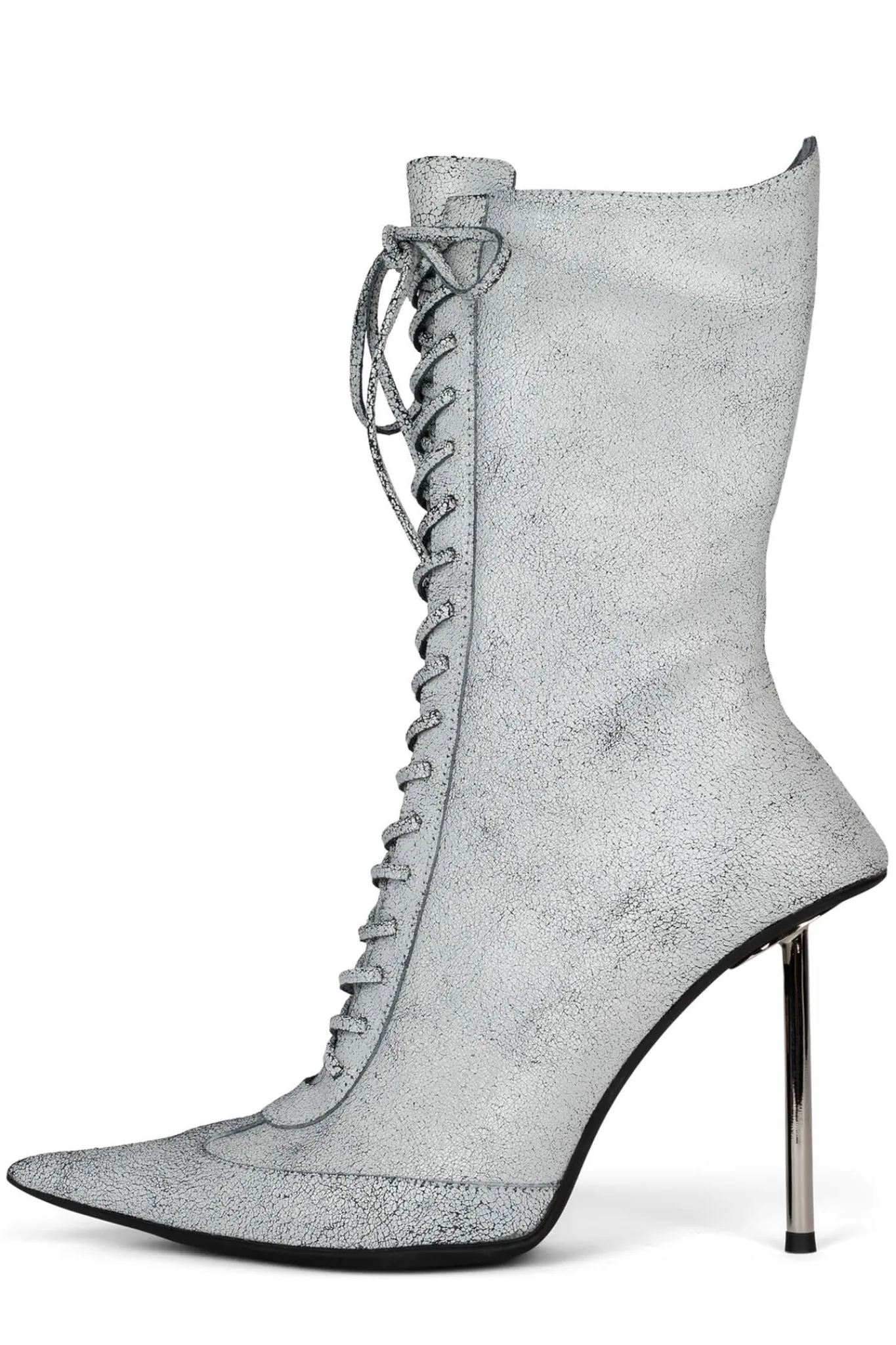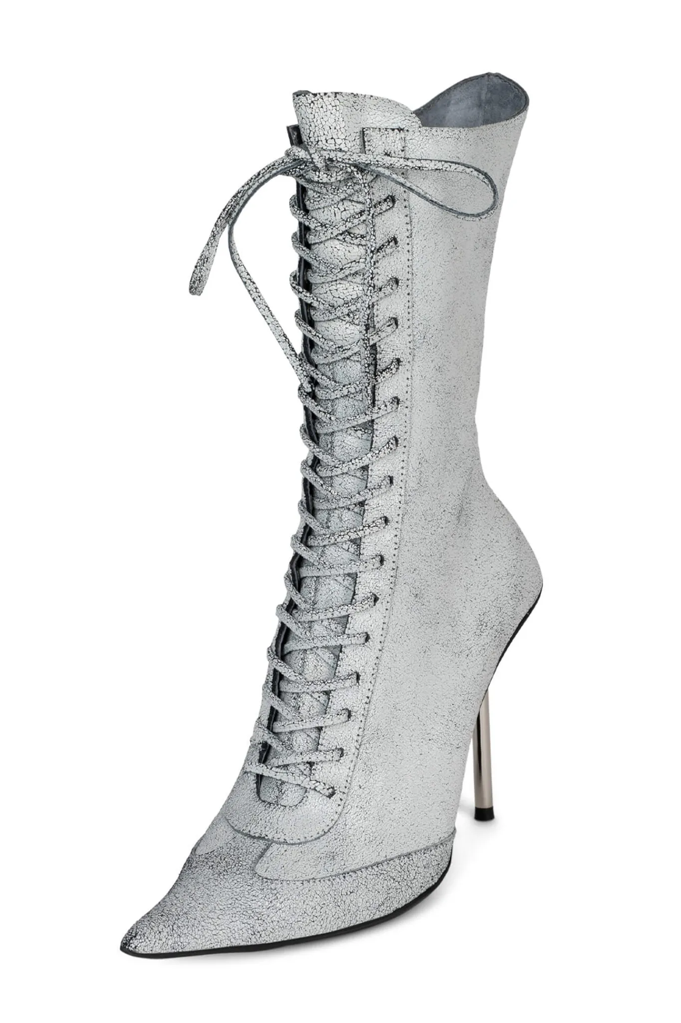 Mid-calf pointed-toe lace-up stiletto bootFits true to sizeMeasurements taken from a size 7 4″ Heel, 0.25″ Platform9″ S…