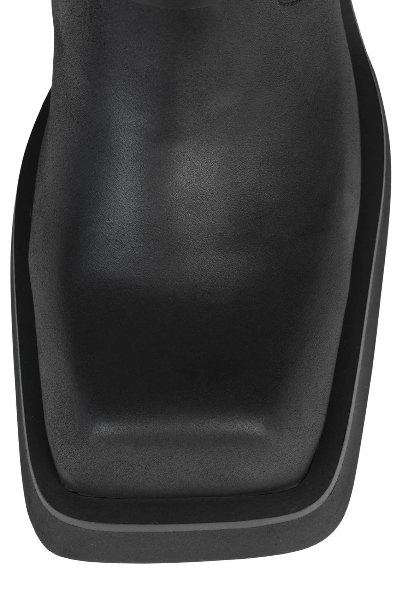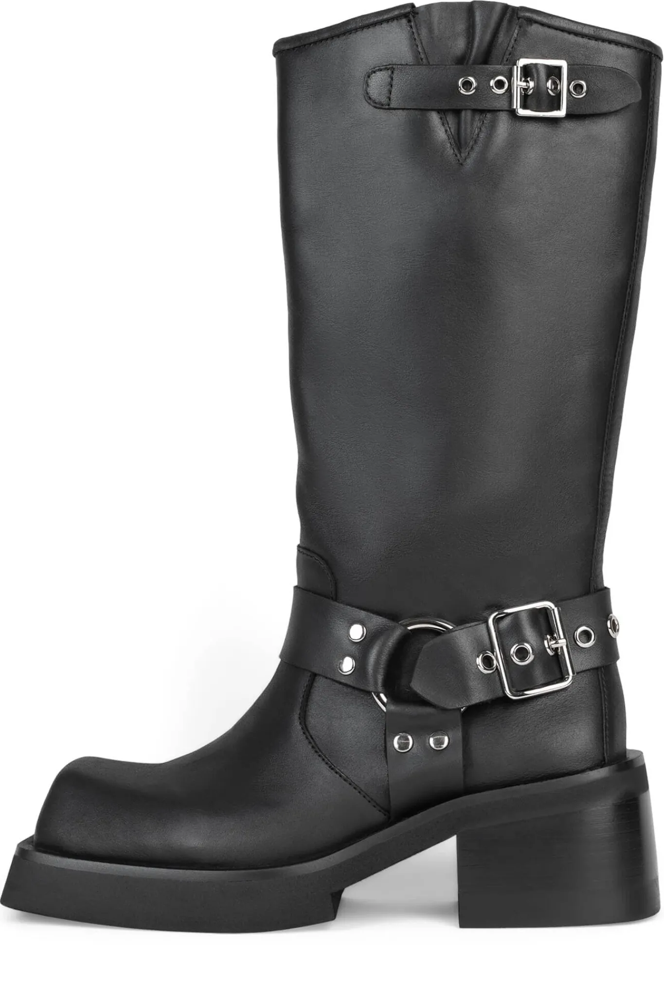 Knee-high square-toe moto boot with harness detailFits true to sizeMeasurements taken from a size 7 2.5″ Heel, 1″ Platf…