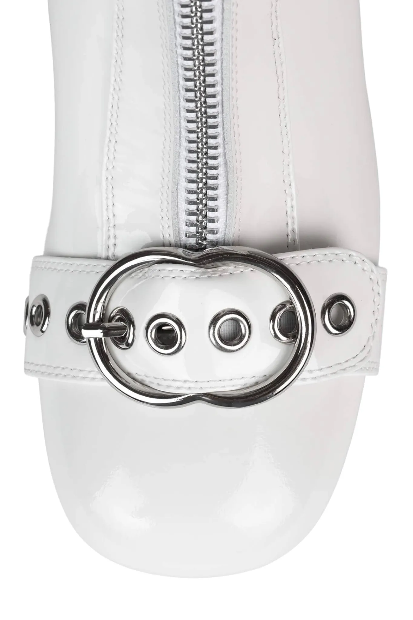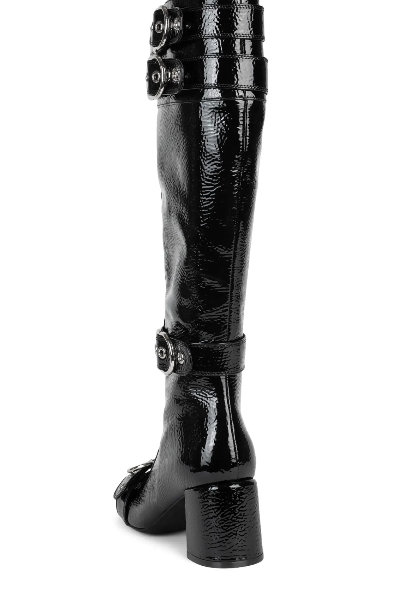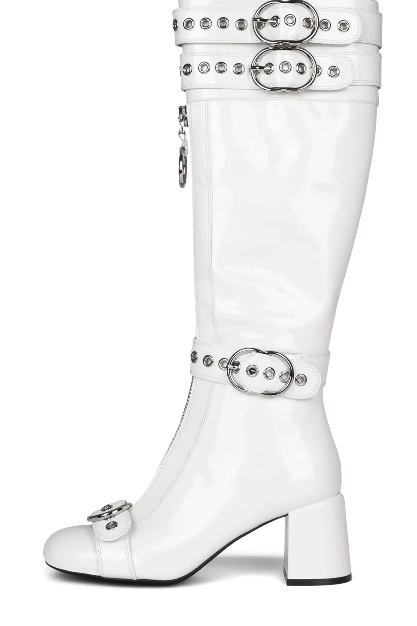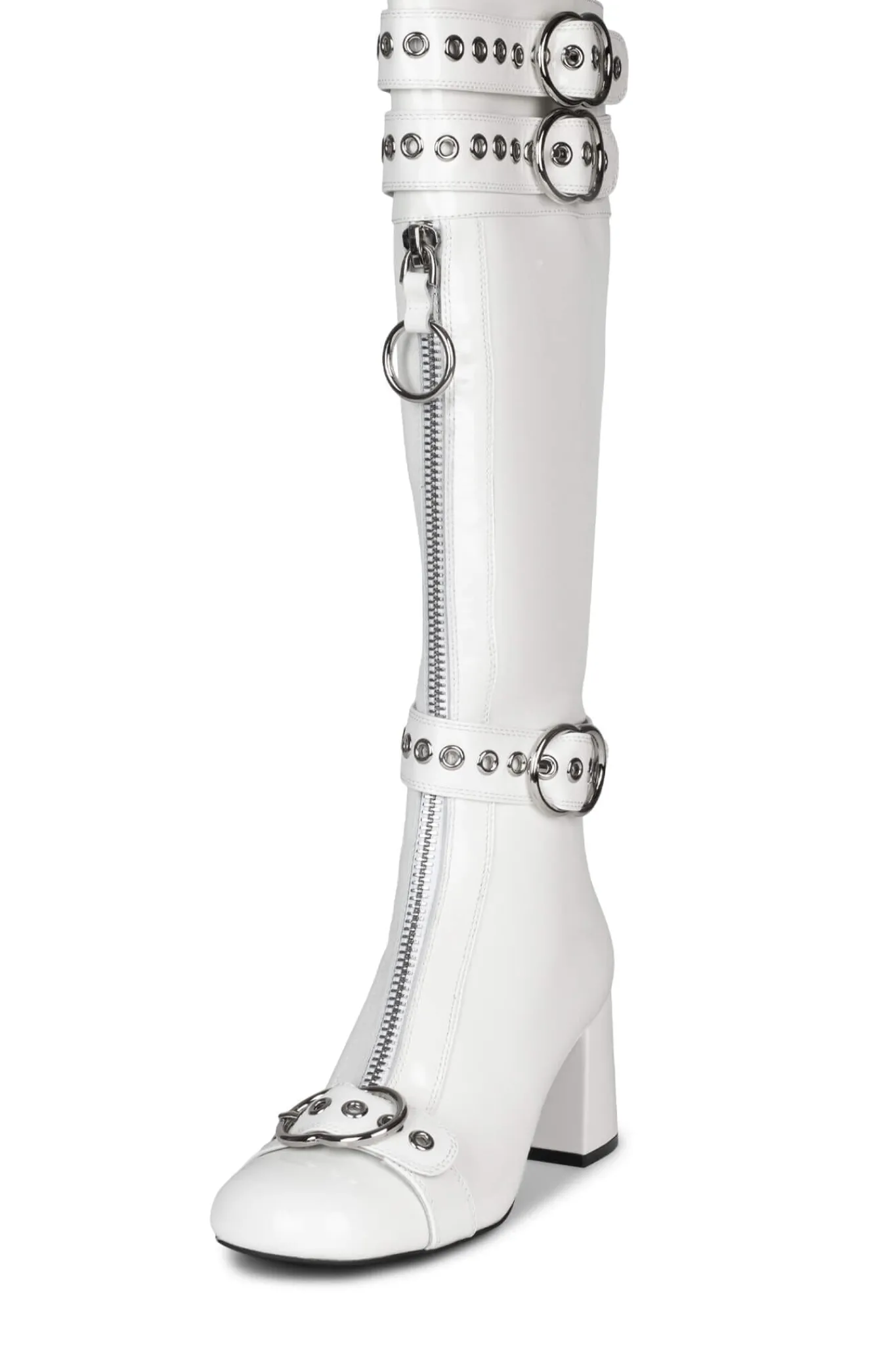 Block heel knee-high boot mod boot with buckle and zipper detail