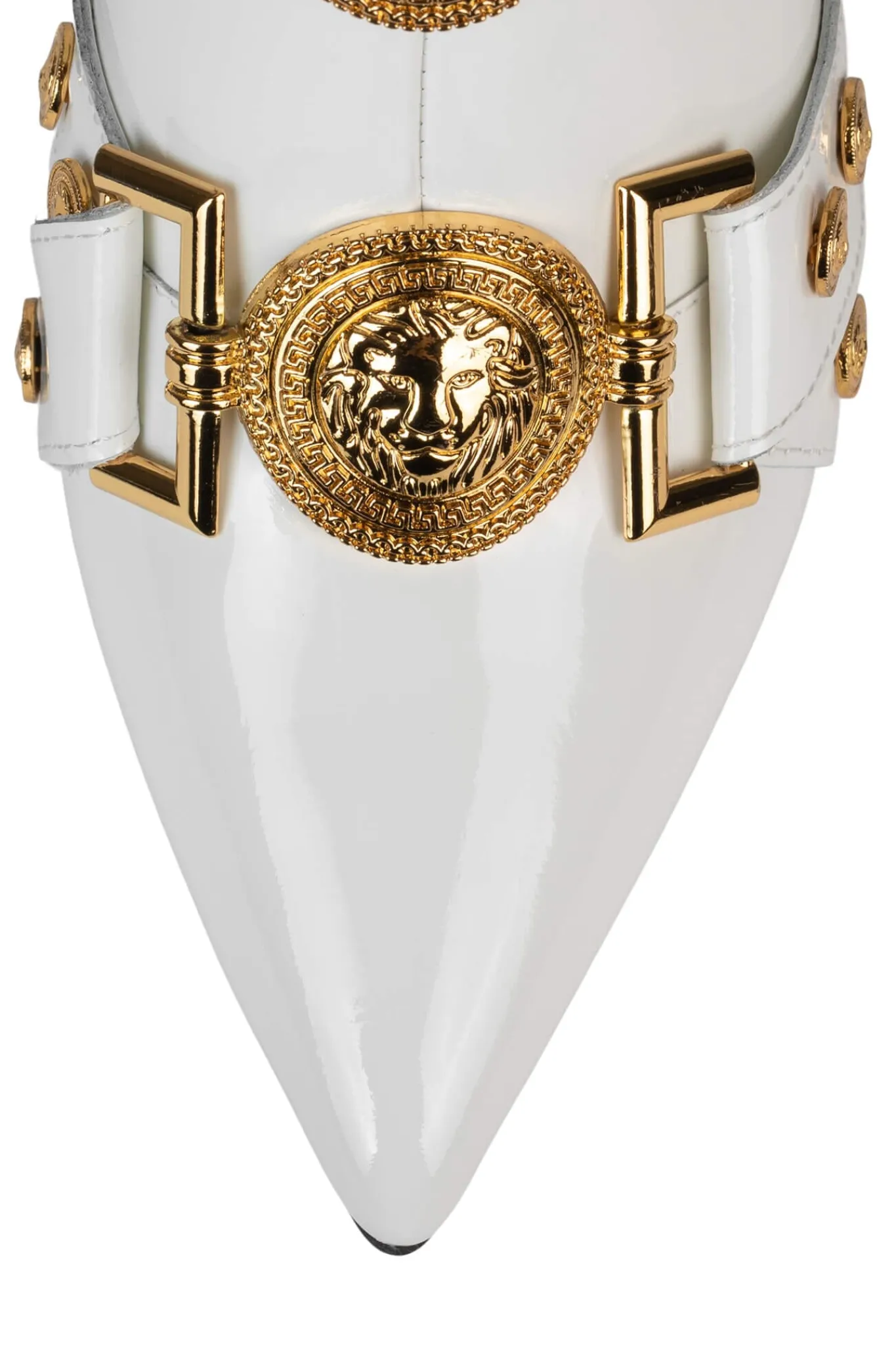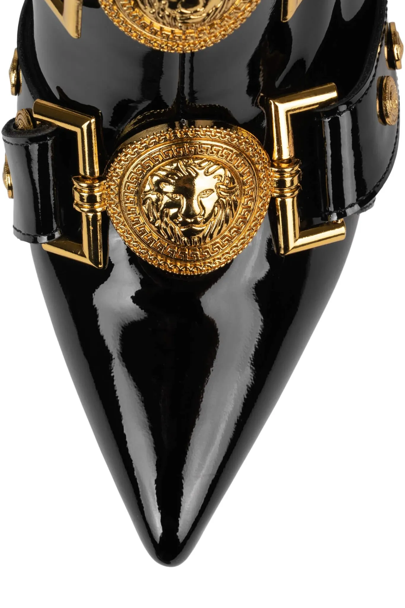 Strappy buckled mid-calf stiletto boot with gold lion emblems