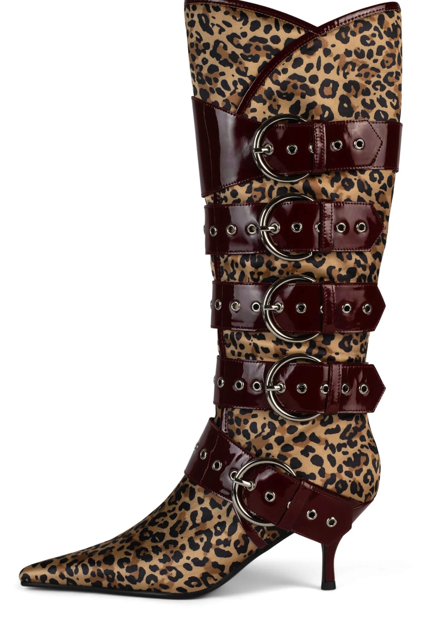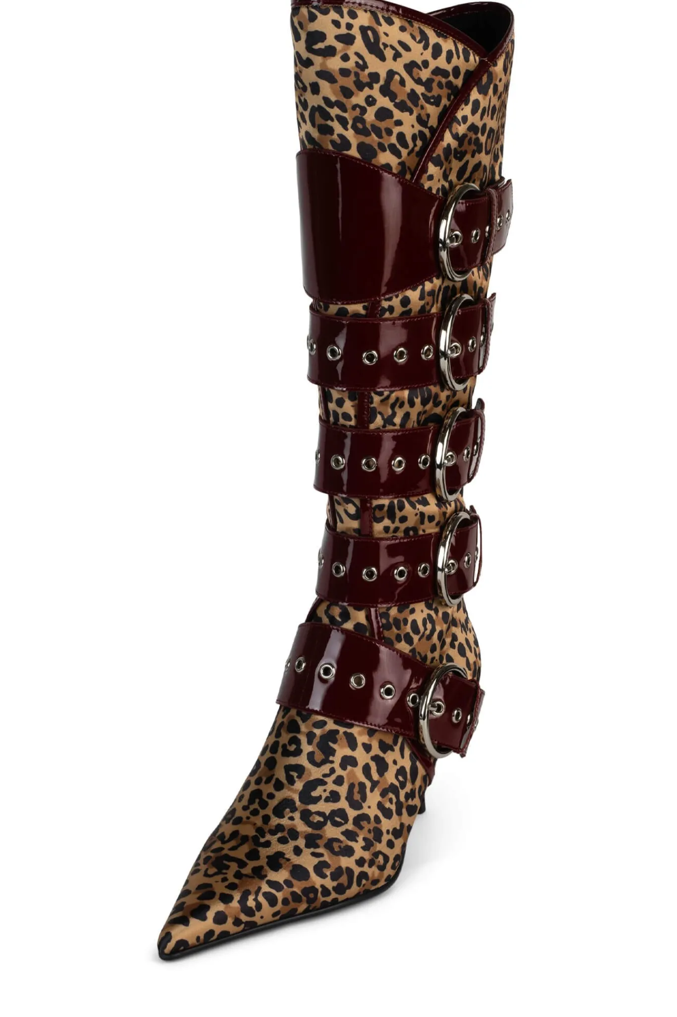 Knee-high pointed-toe heeled boot with strap and buckle detail