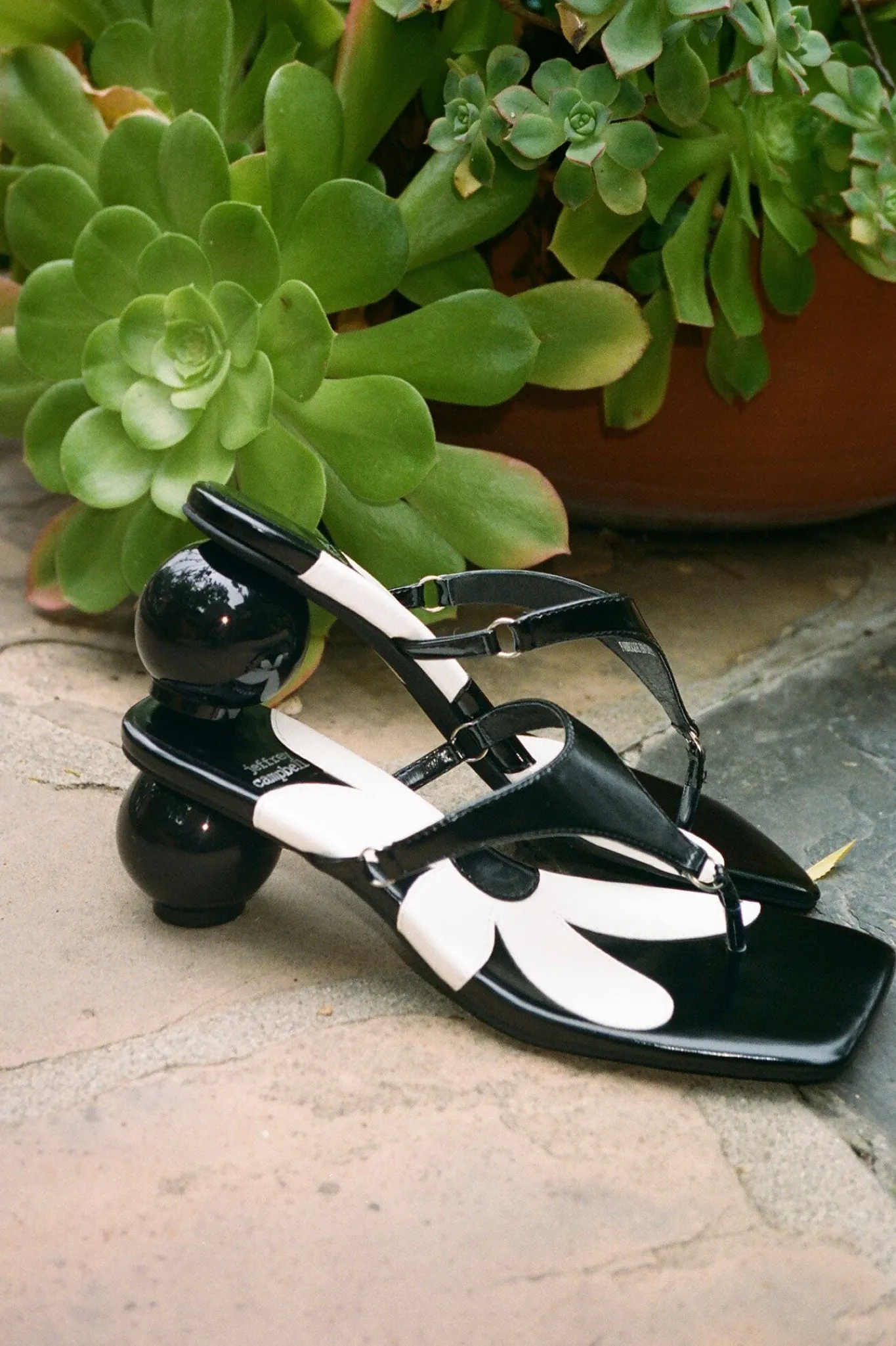 Architectural ball heel square-toe thong sandal with multi-colored flower sock detailing.