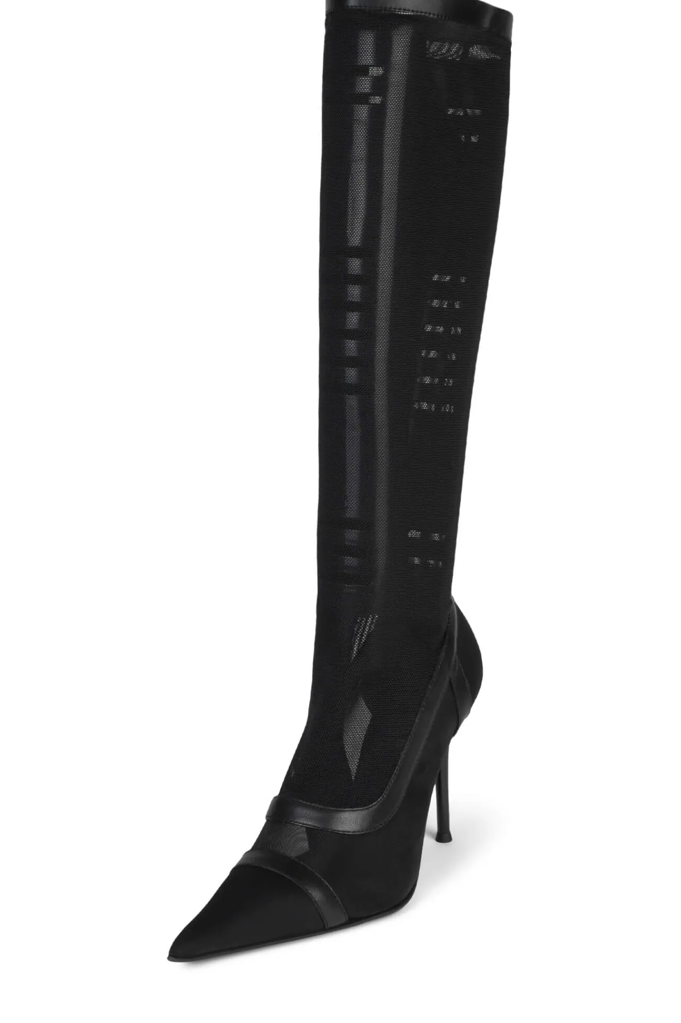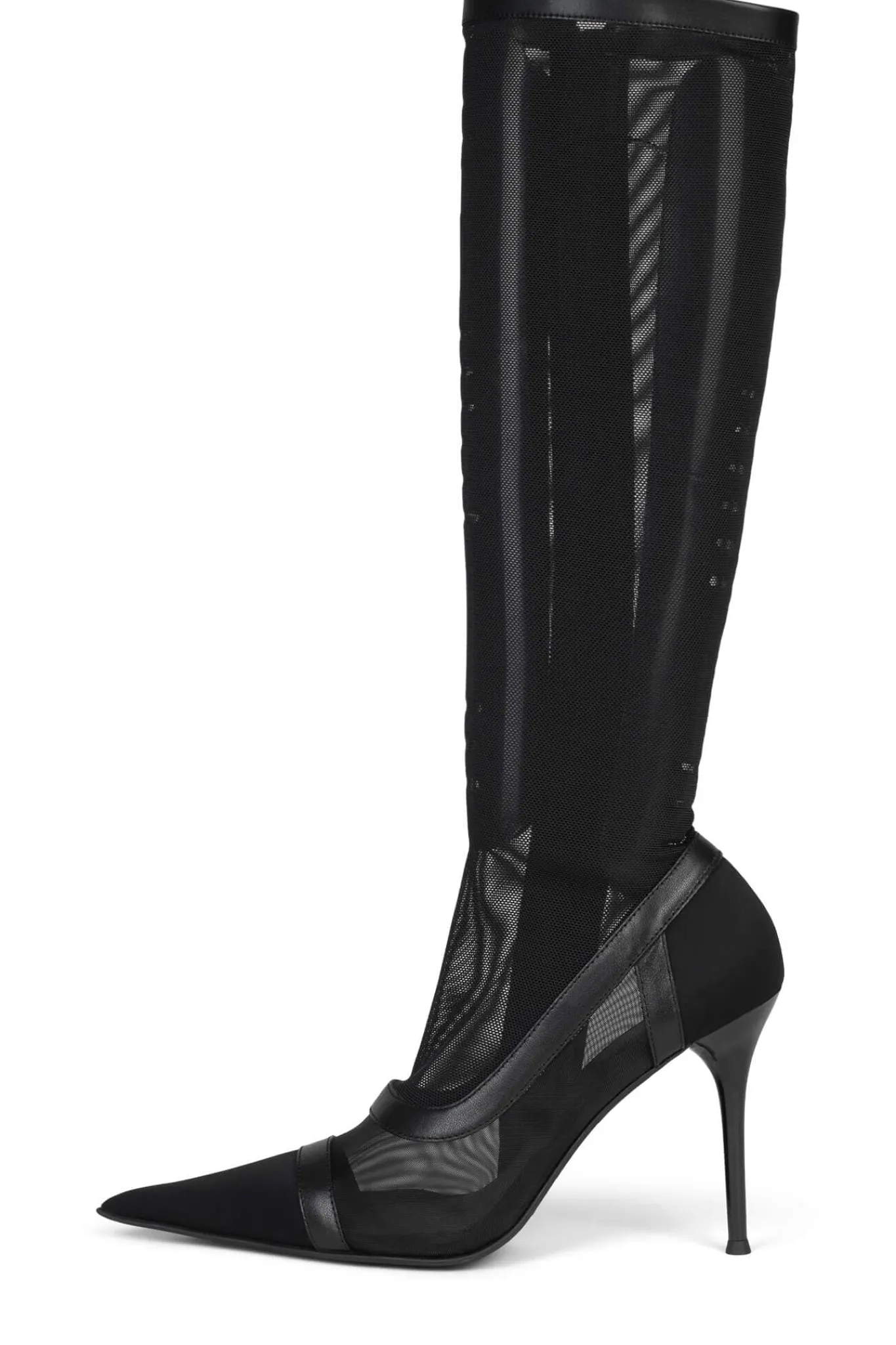 Pointed-toe stiletto mesh knee-high boot with leather contrast