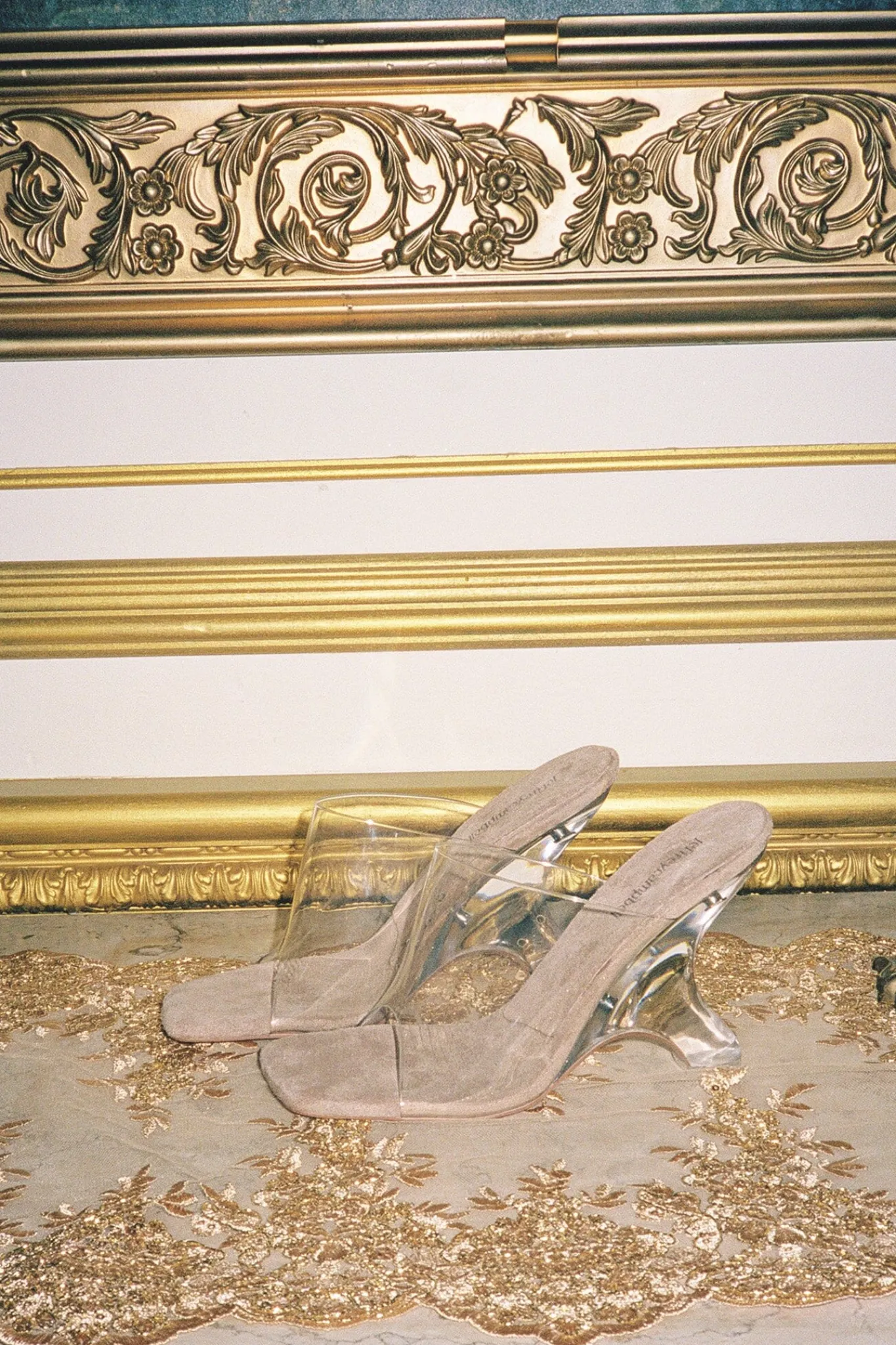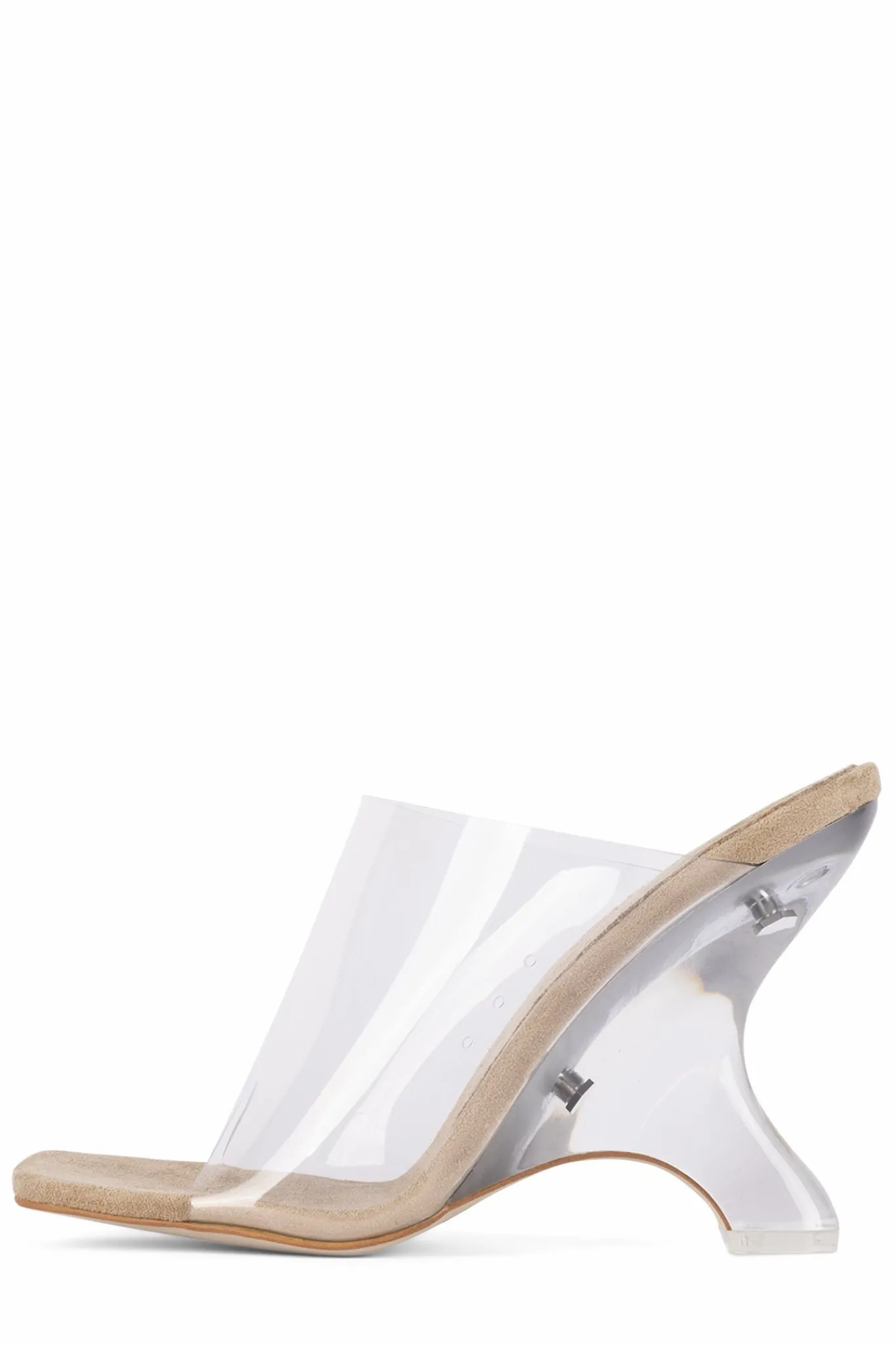 Vinyl mule with sculptural lucite wedge.