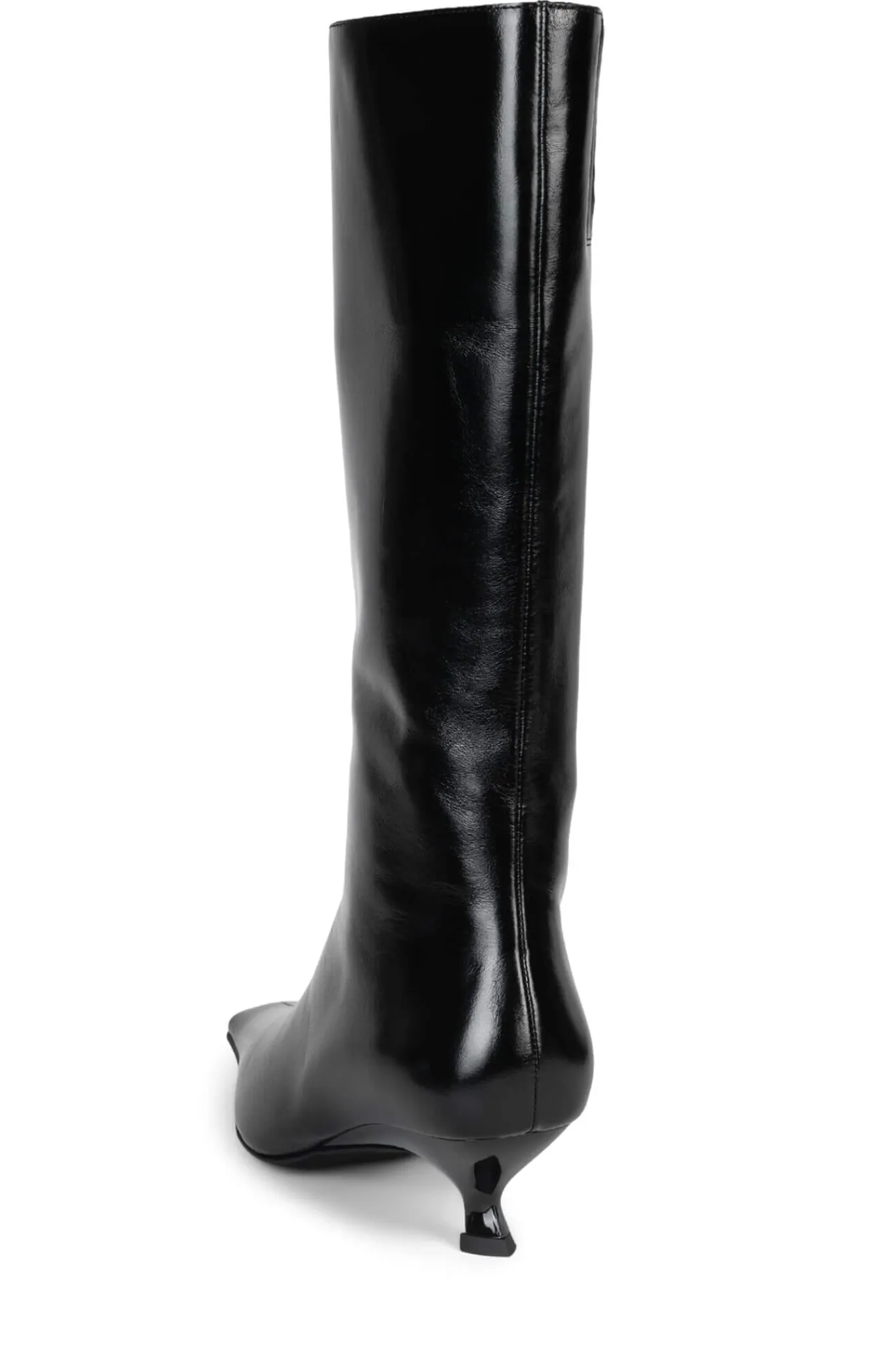 Elongated square-toe knee-high sculpted kitten-heel boot