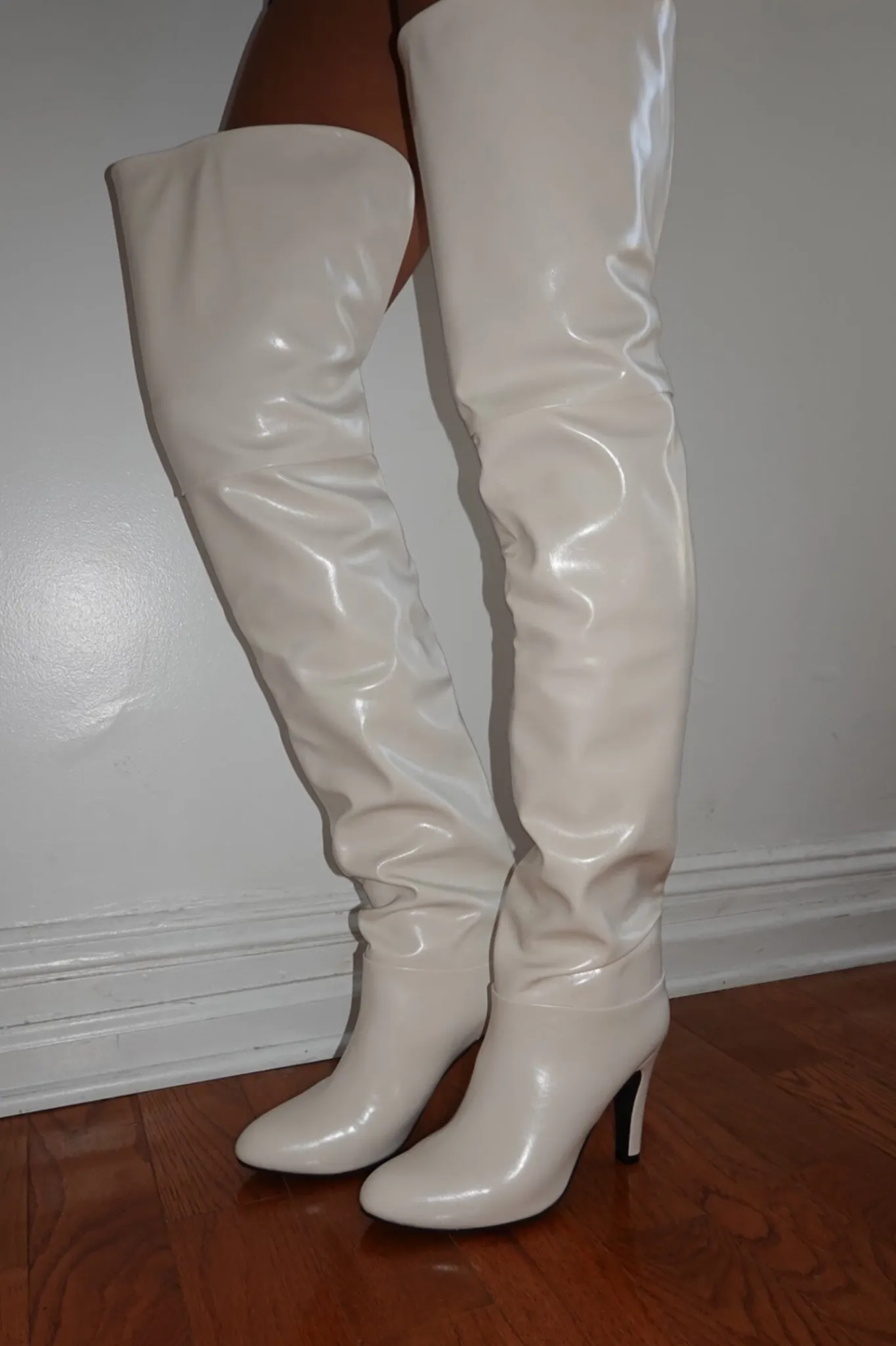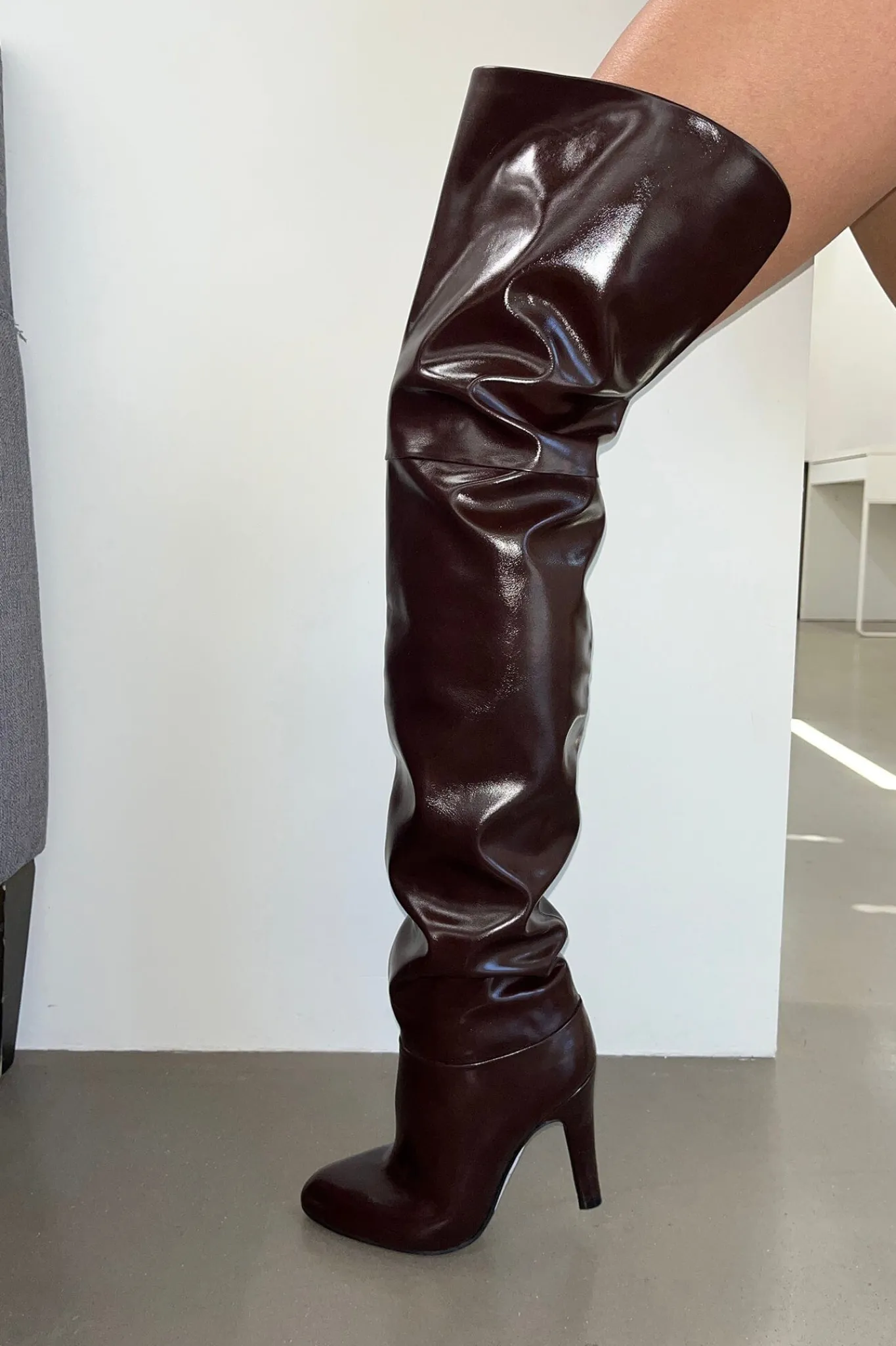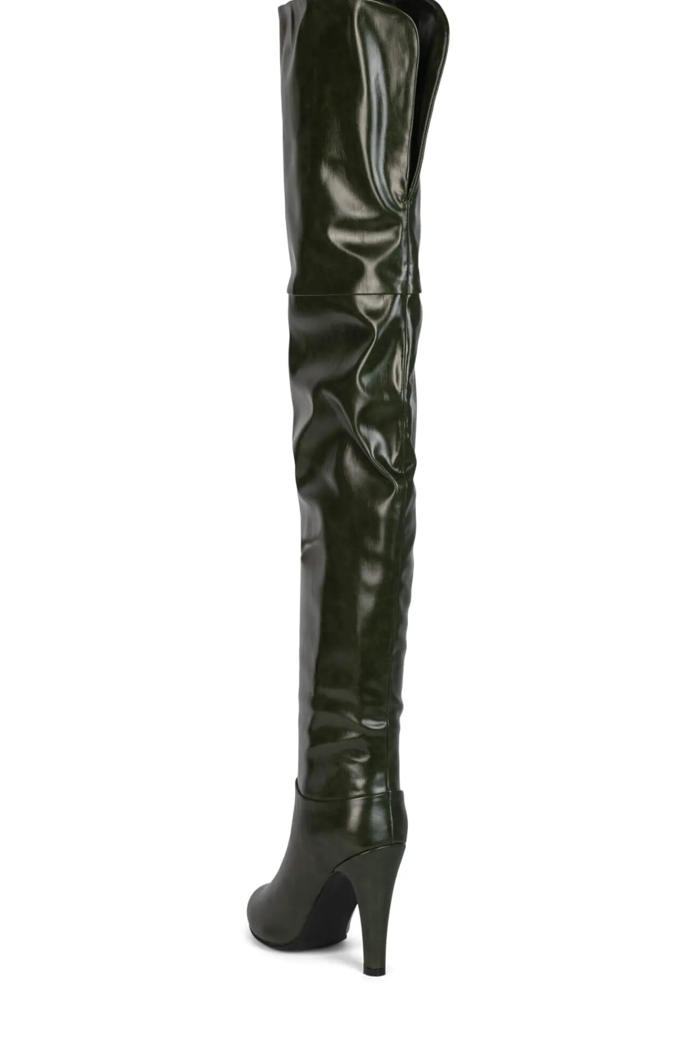 Almond-toe thigh-high heeled slouch bootFits true to sizeMeasurements taken from size 74″ Heel, 0.25″ Platform24.5″ Shaf…