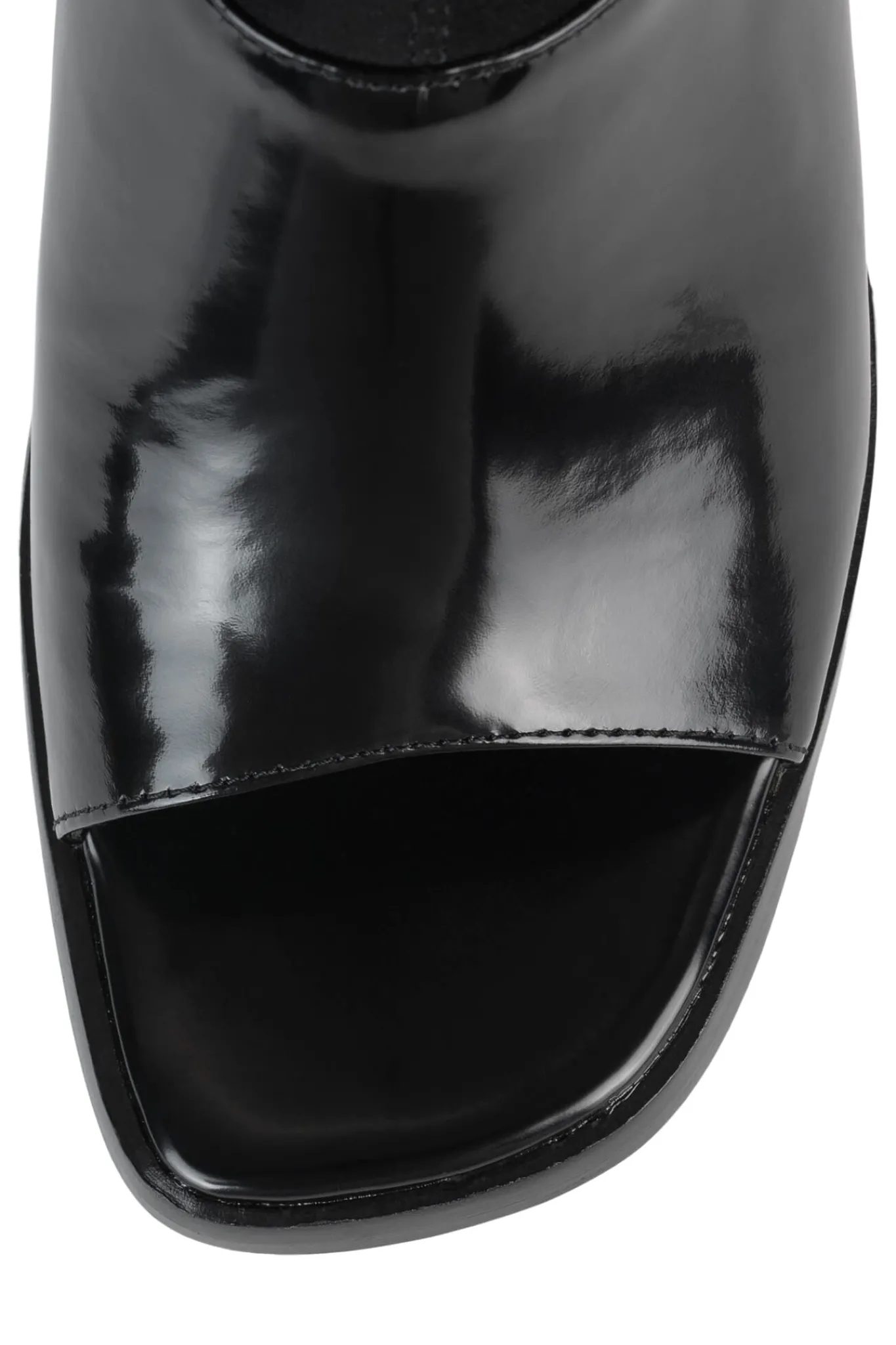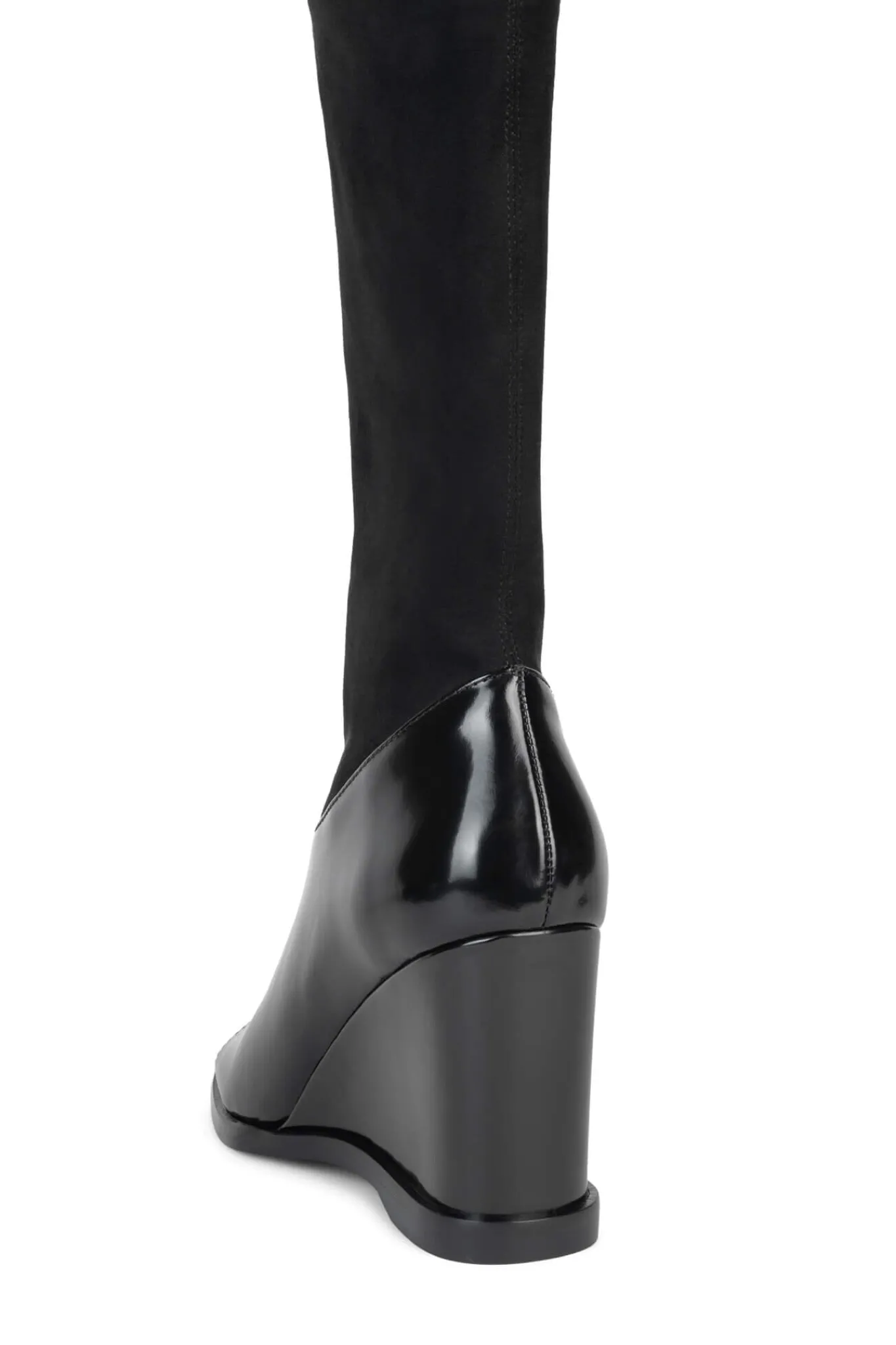 Mid-calf mixed-material wedge boot with open toeFits true to sizeMeasurements taken from a size 7 3″ Heel, 0.25″ Platfo…