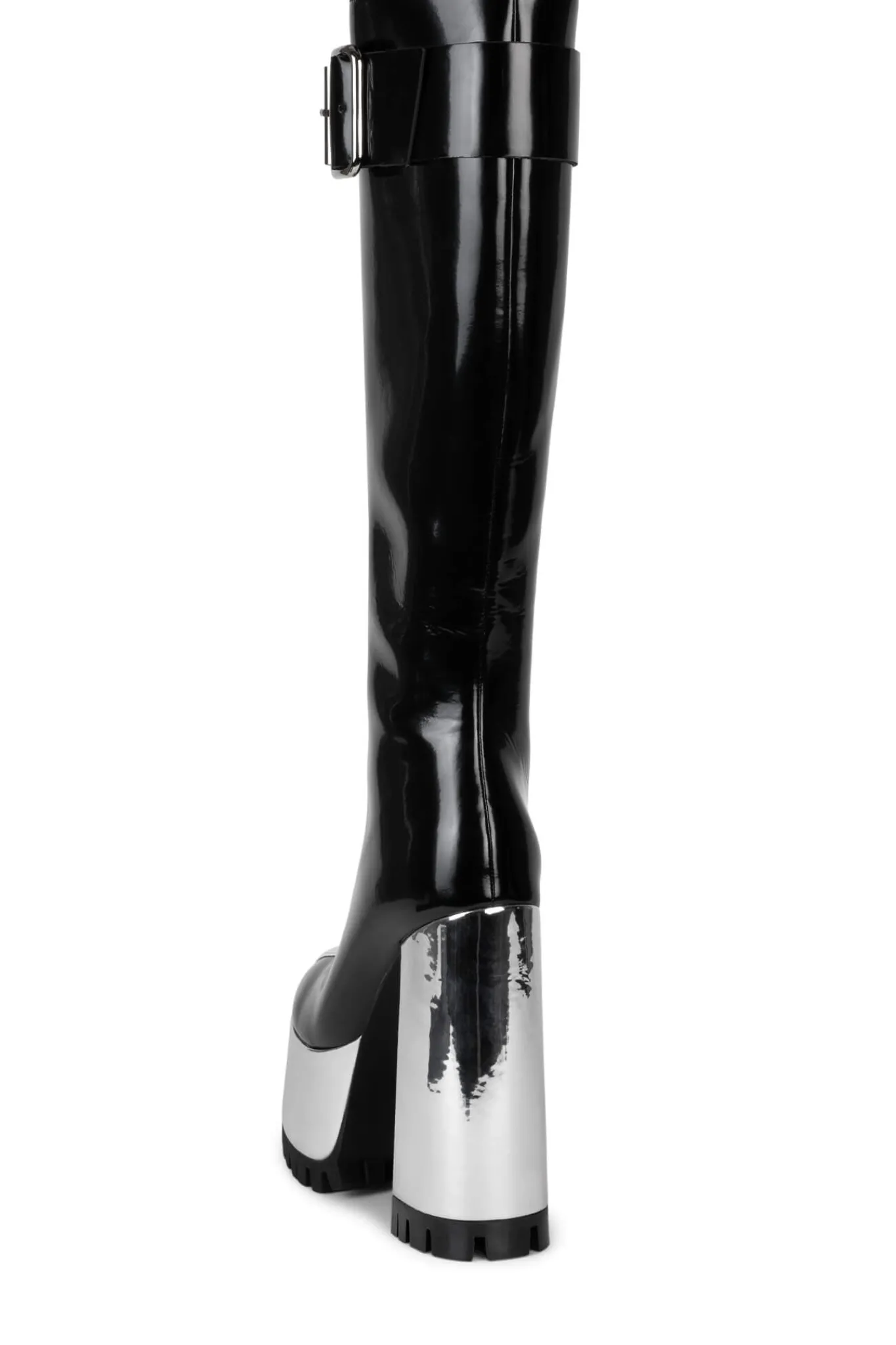 Knee-high boot with buckle detail and metallic platform Fits true to sizeMeasurements taken from a size 7 5.5″ Heel, 2…