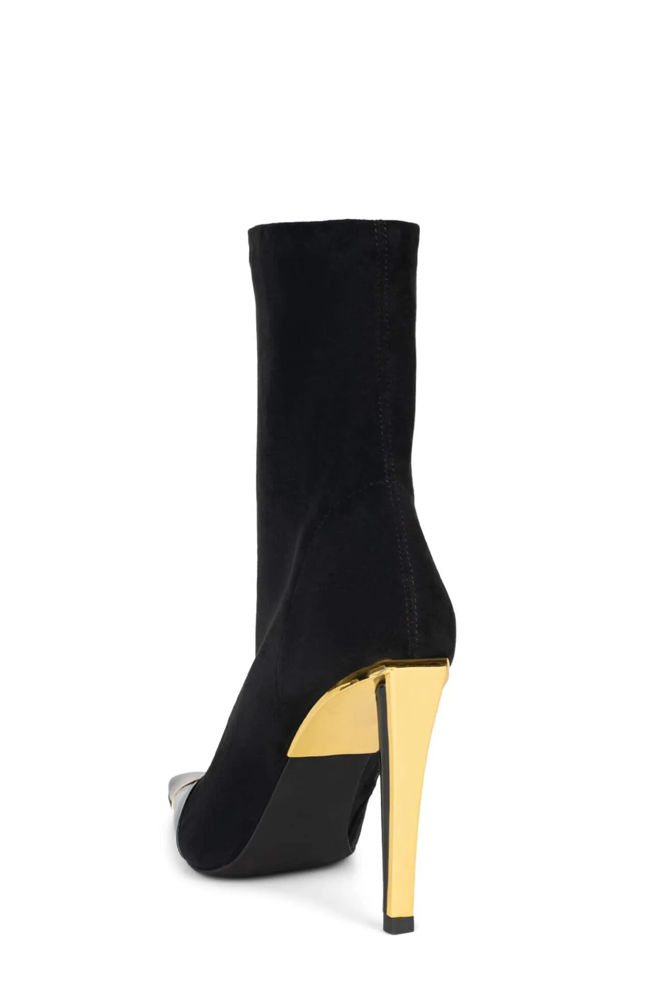 Mid-calf stiletto pointed-toe boot with metal contrastFits true to sizeMeasurements taken from a size 7 4″ Heel, 0.25″ …