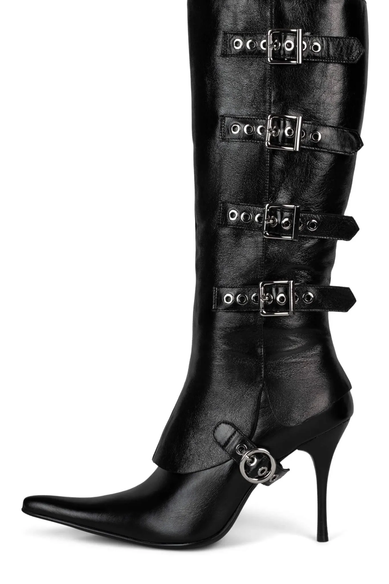 Pointed-toe knee-high stiletto boot with buckle detailFits true to sizeMeasurements taken from size 7 4″ Heel, 0.25″ Pl…
