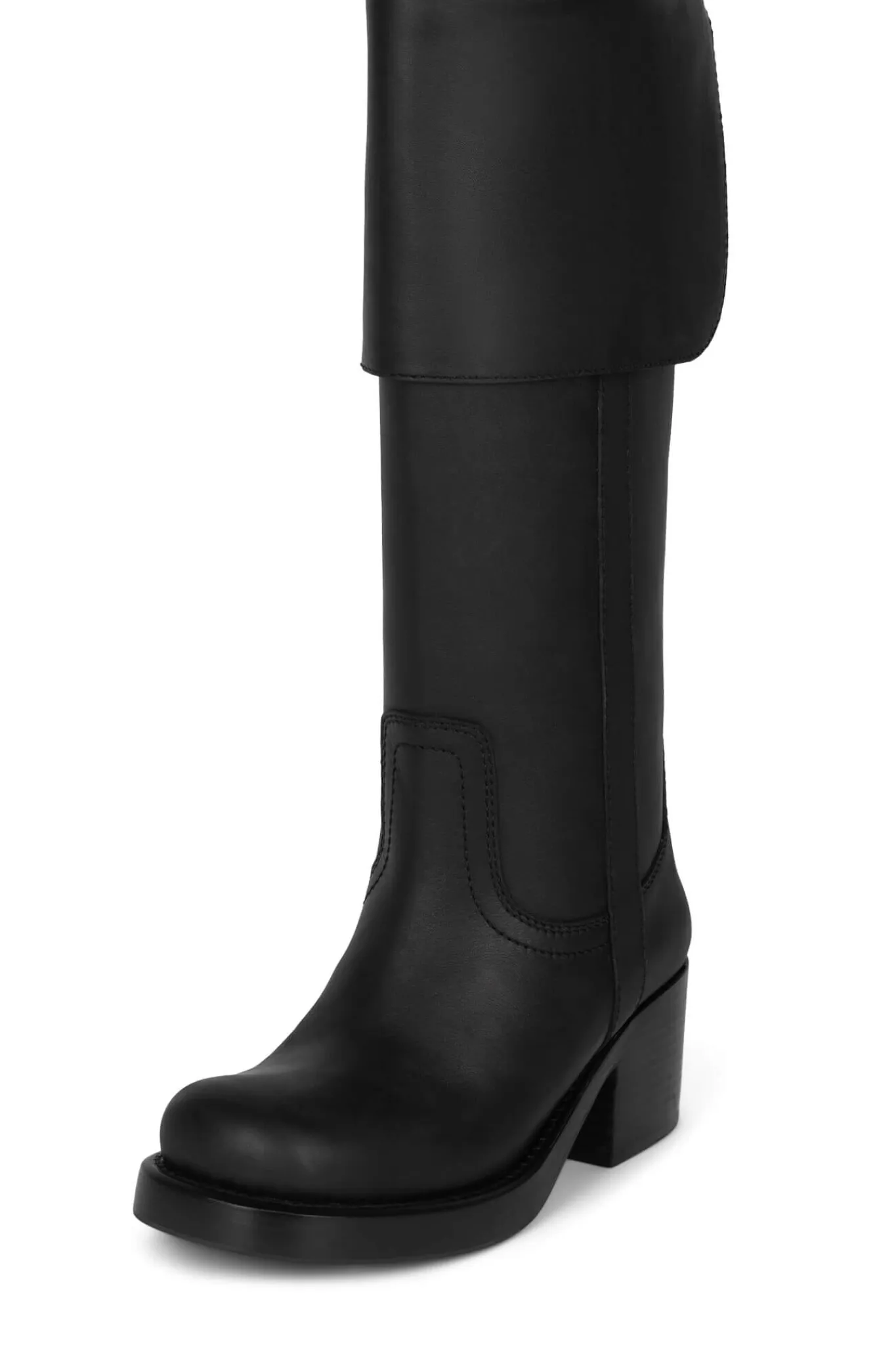 Stacked heel boot; can be worn cuffed for knee high or uncuffed for over the knee