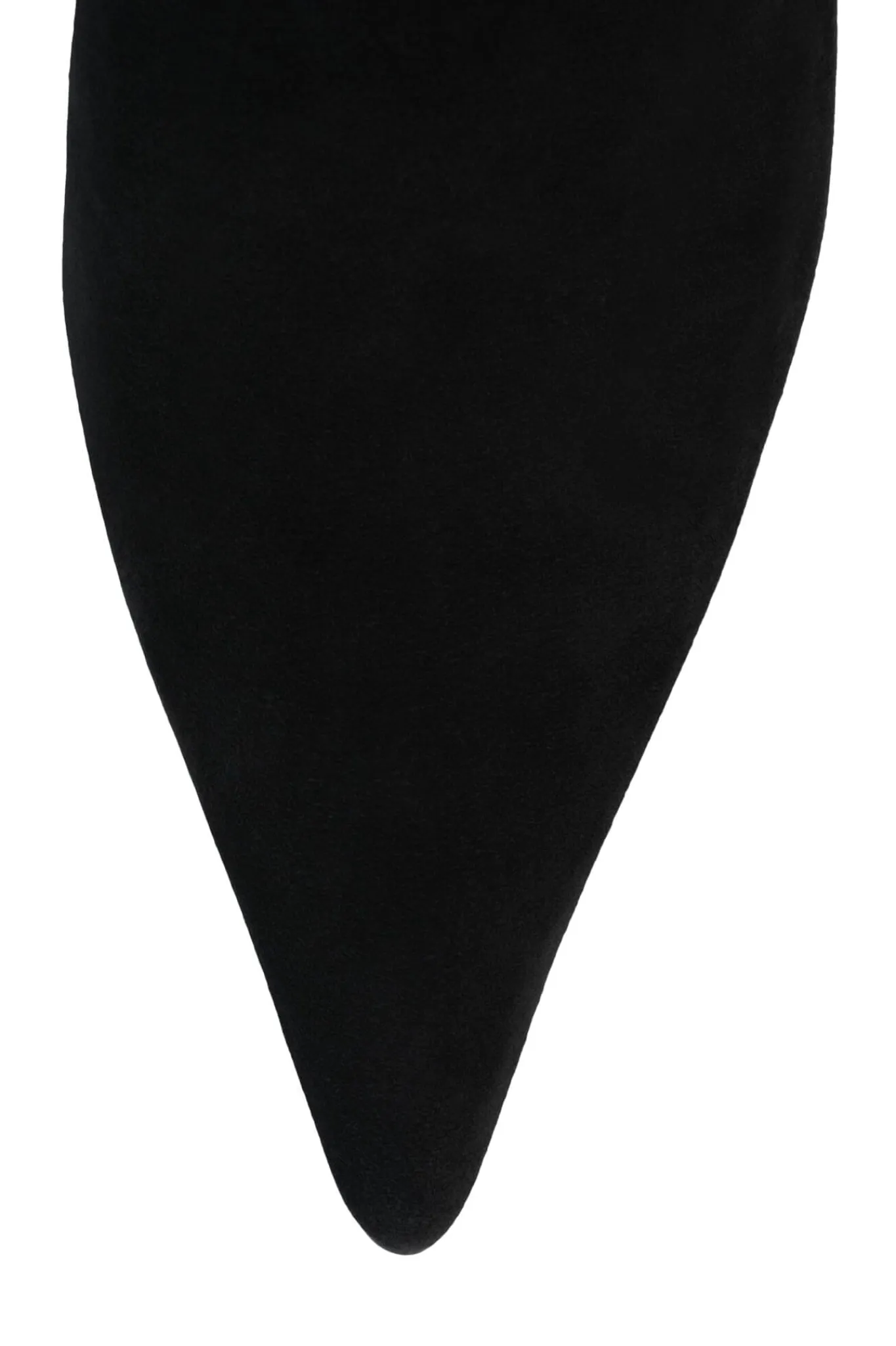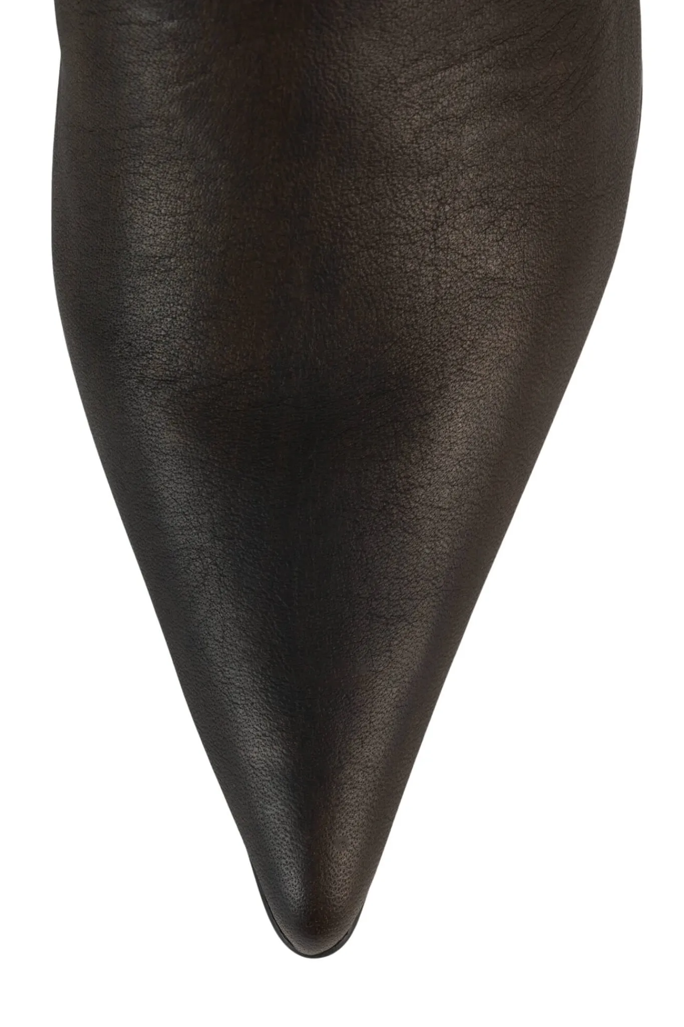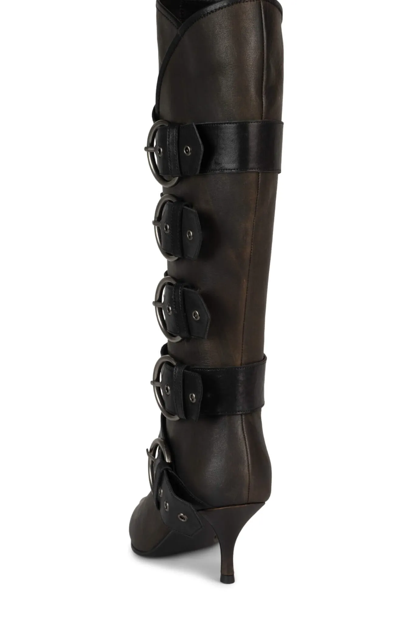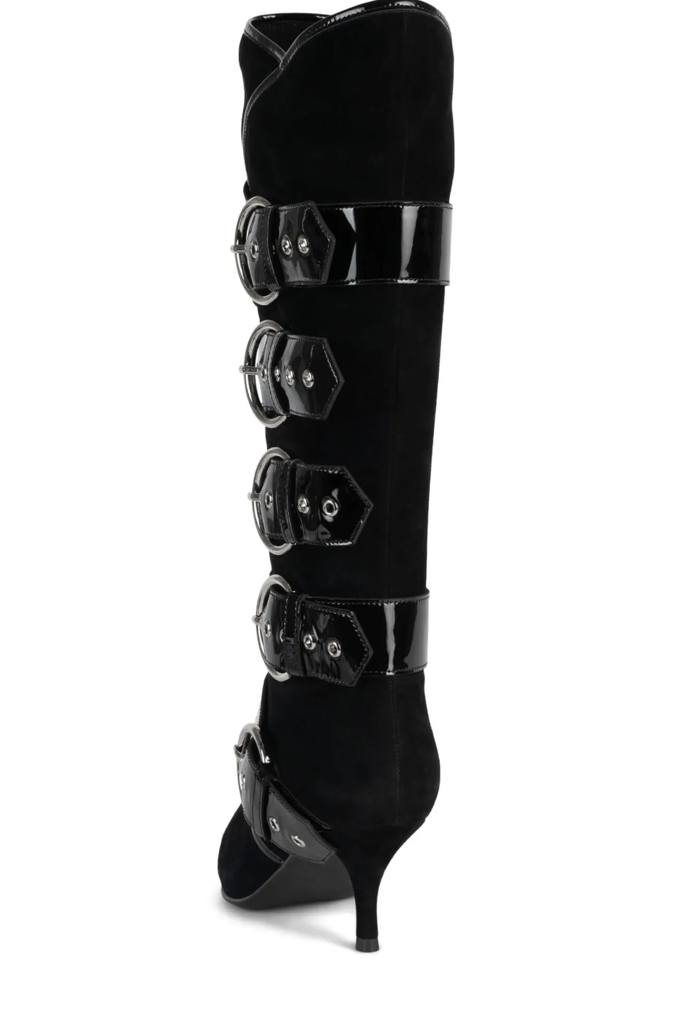 Knee-high pointed-toe heeled boot with strap and buckle detail