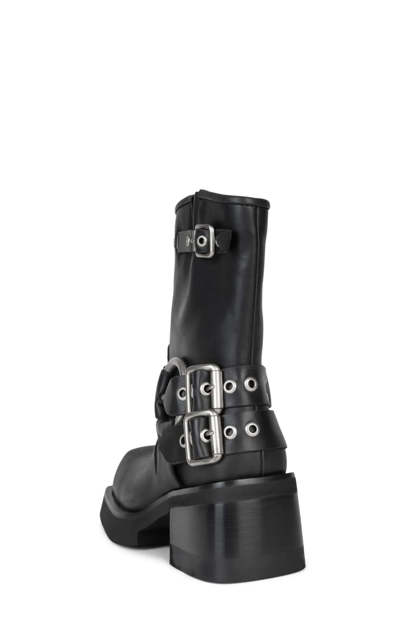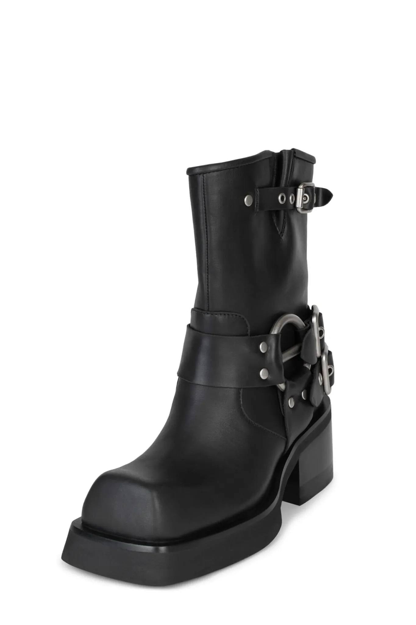 Mid-calf biker-inspired boot with exaggerated toeFits true to sizeMeasurements taken from a size 7 2.5″ Heel, 0.75″ Pla…