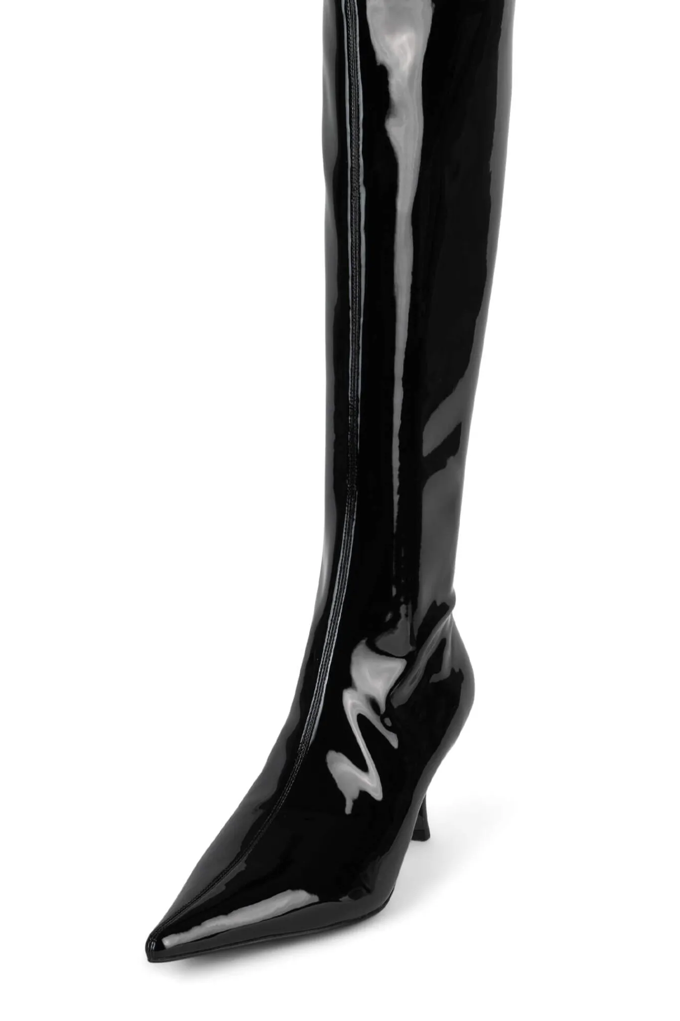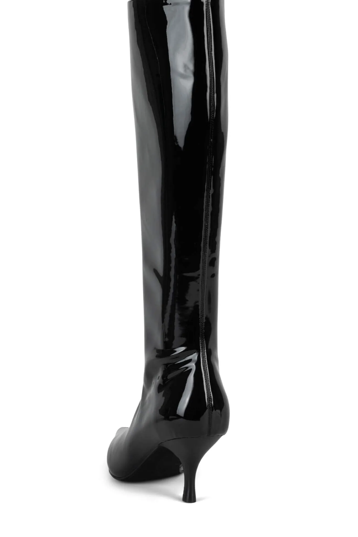Pointed-toe knee-high heeled boot Fits true to sizeMeasurements taken from size 7 2.65″ Heel, 0.25″ Platform14.5″ Shaf…