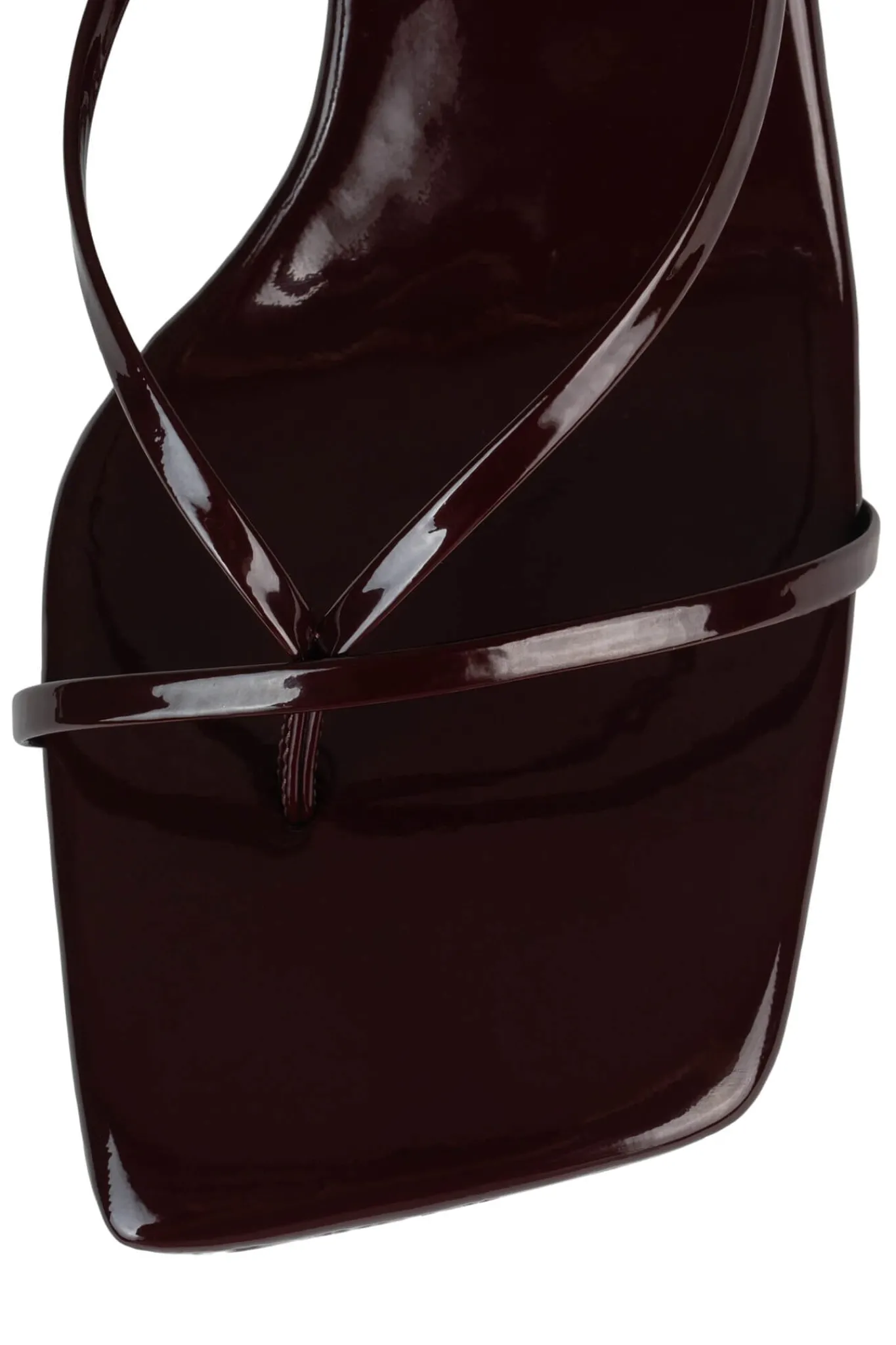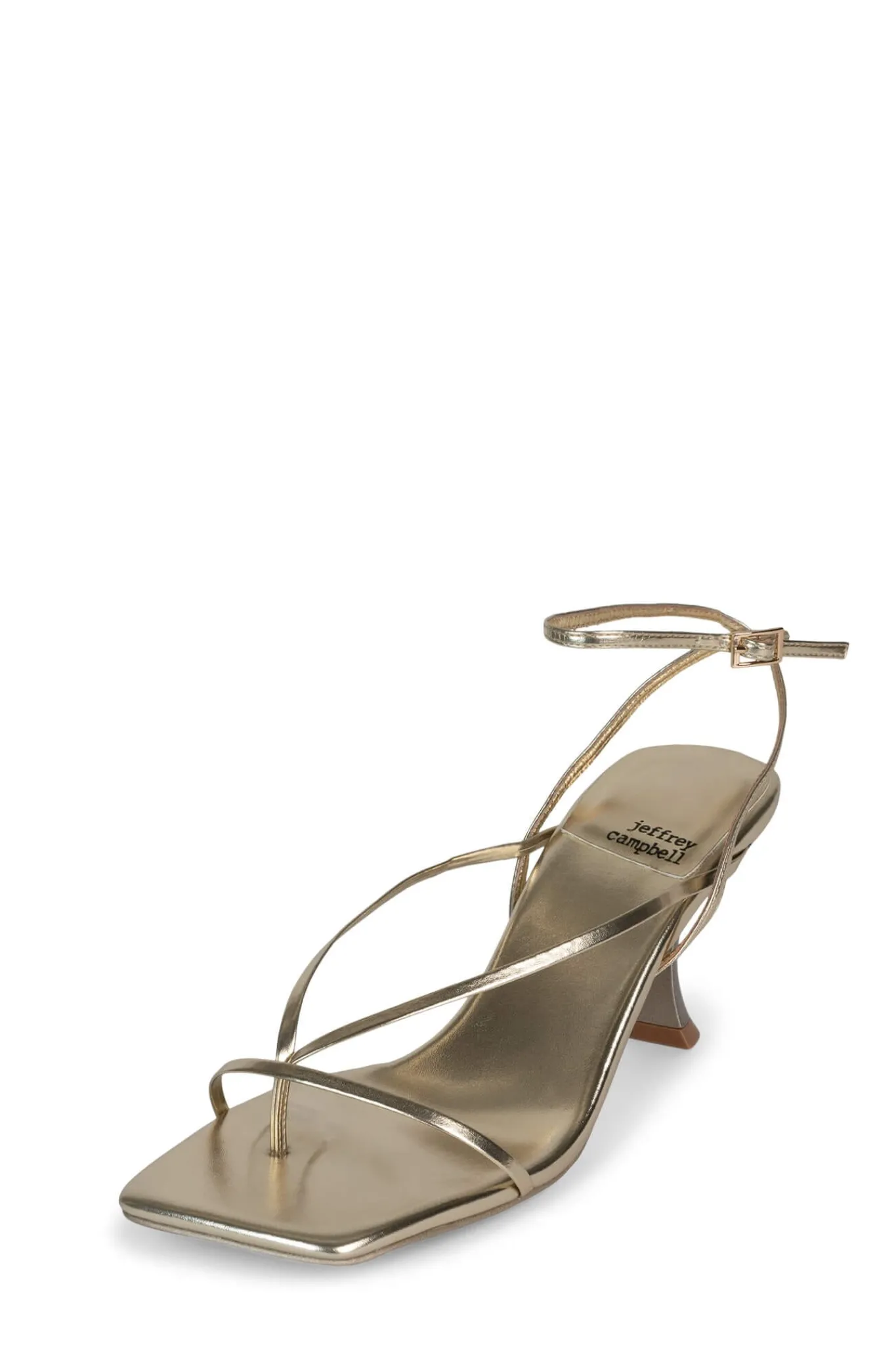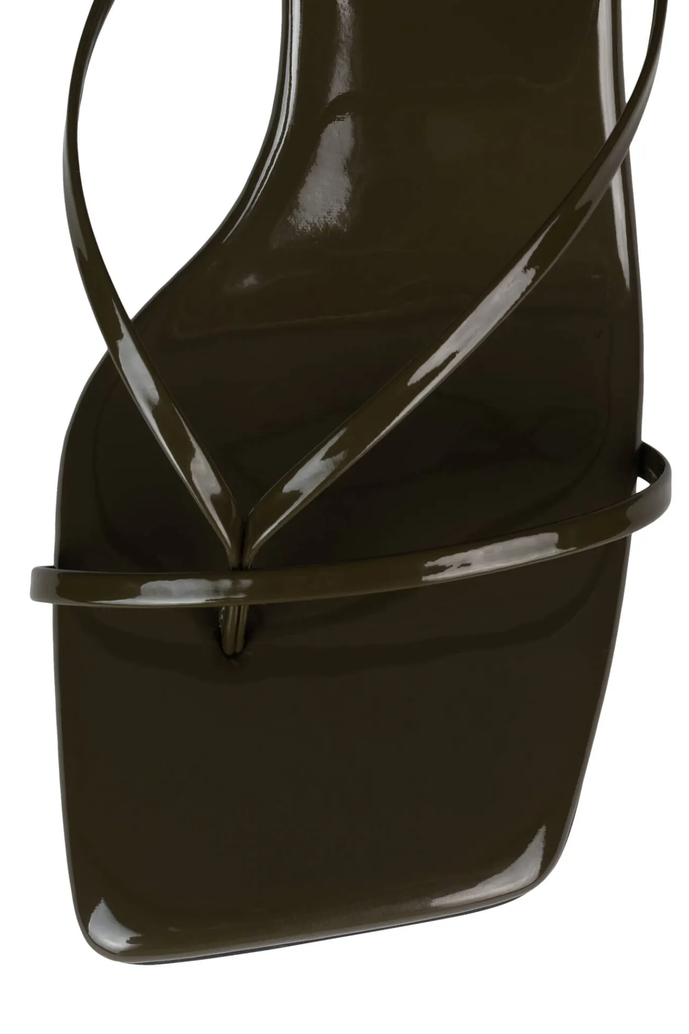 Square-toe, mid-heel strappy thong sandal with ankle strap.