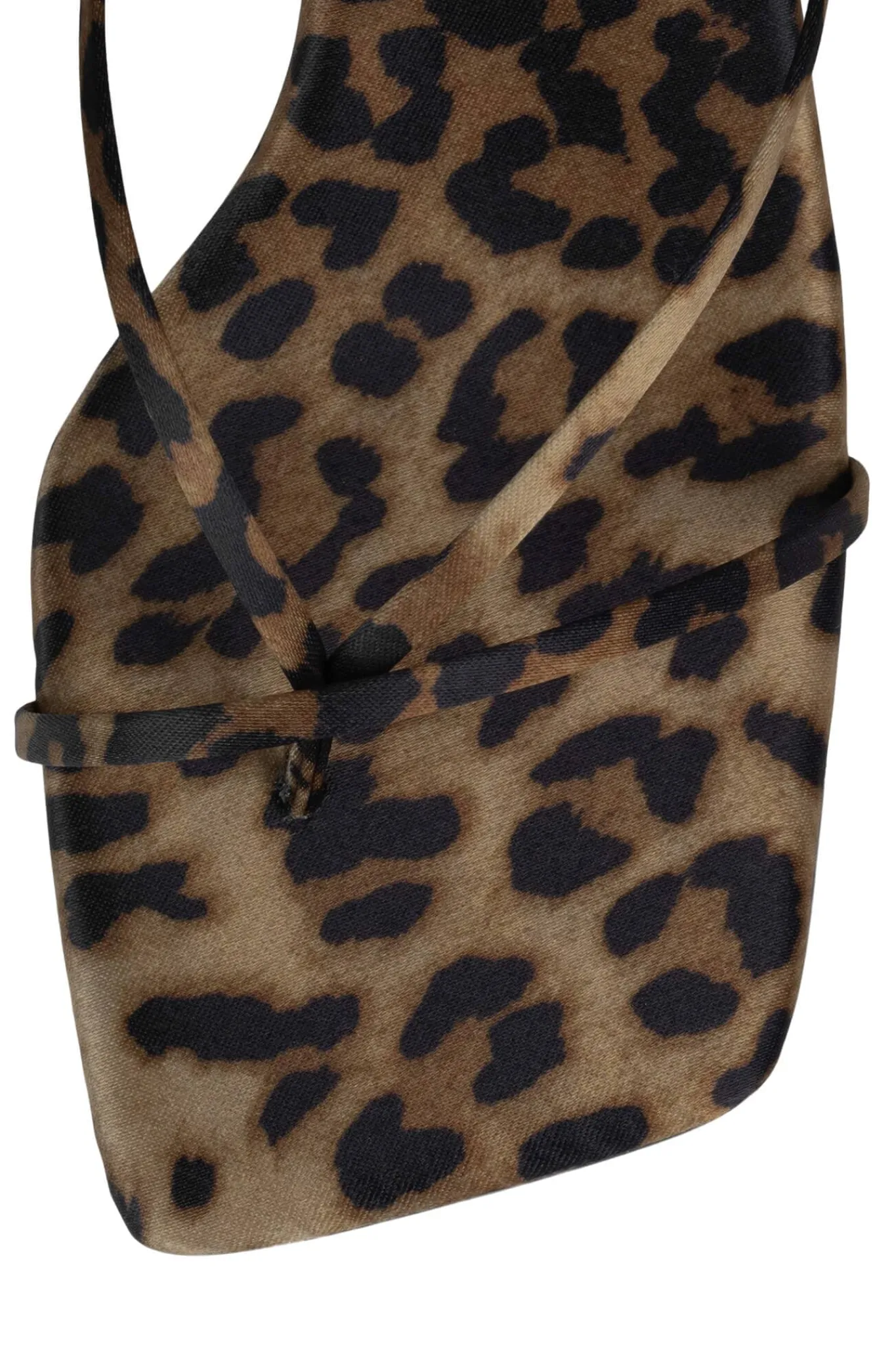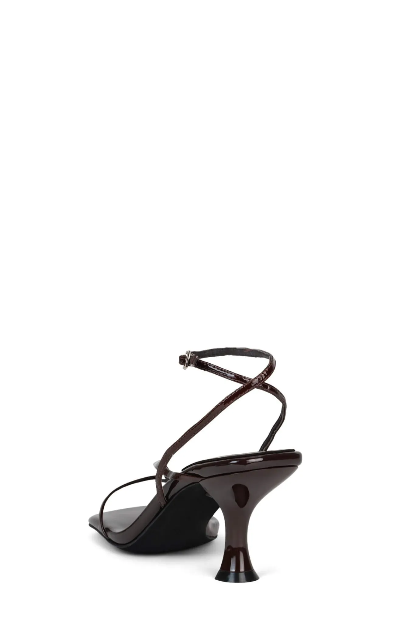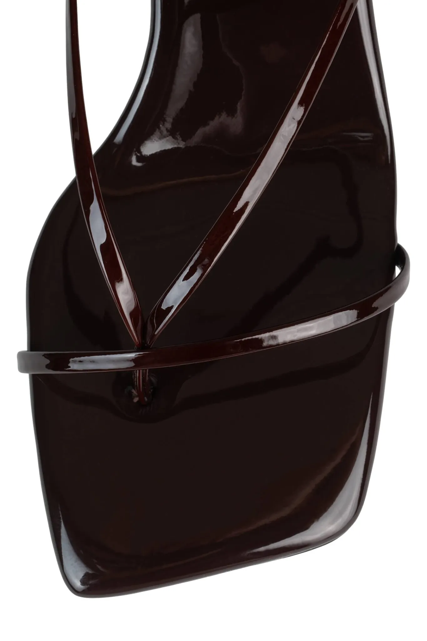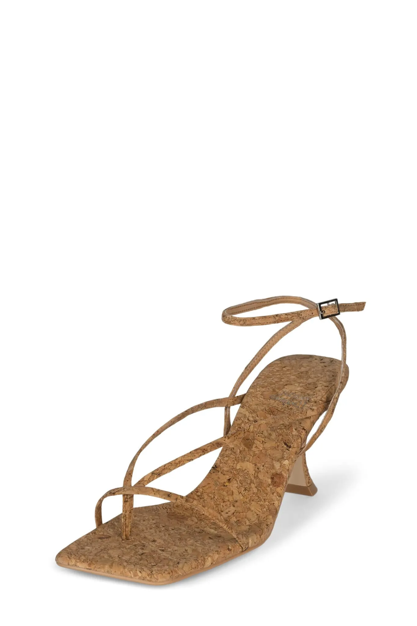 Square-toe, mid-heel strappy thong sandal with ankle strap.