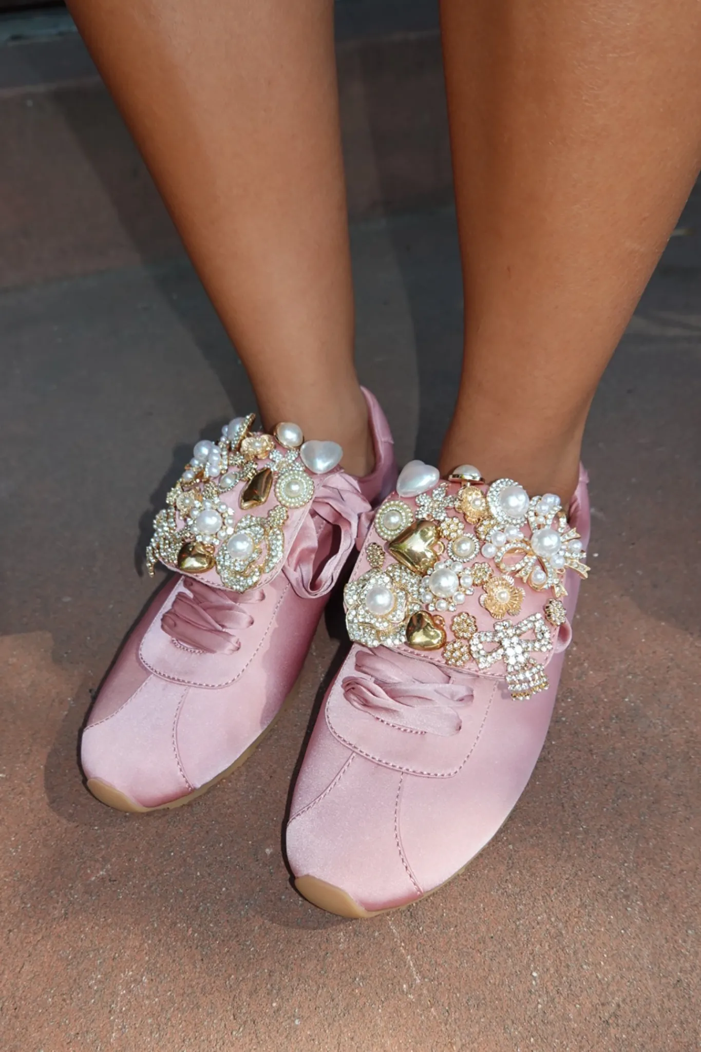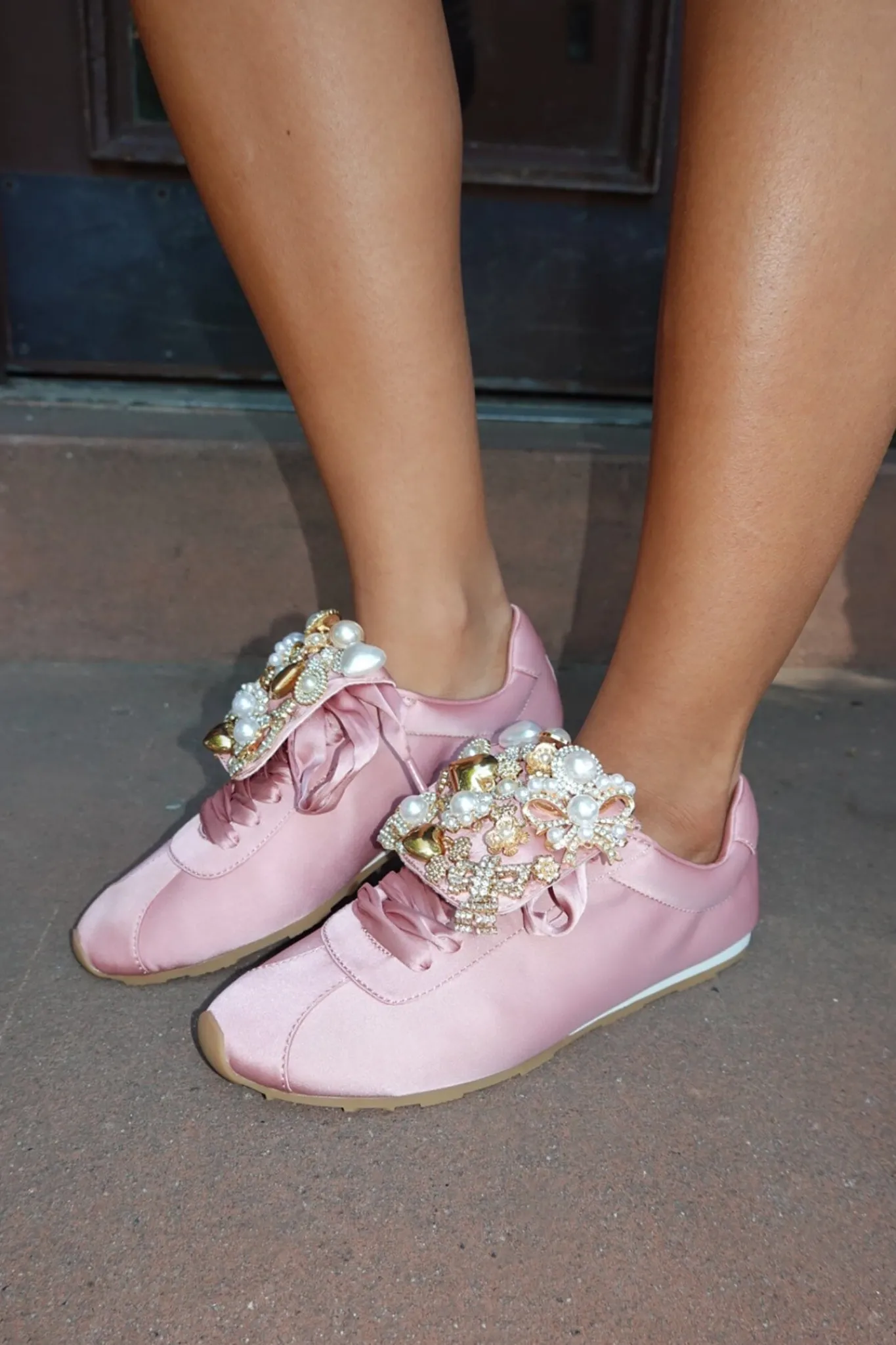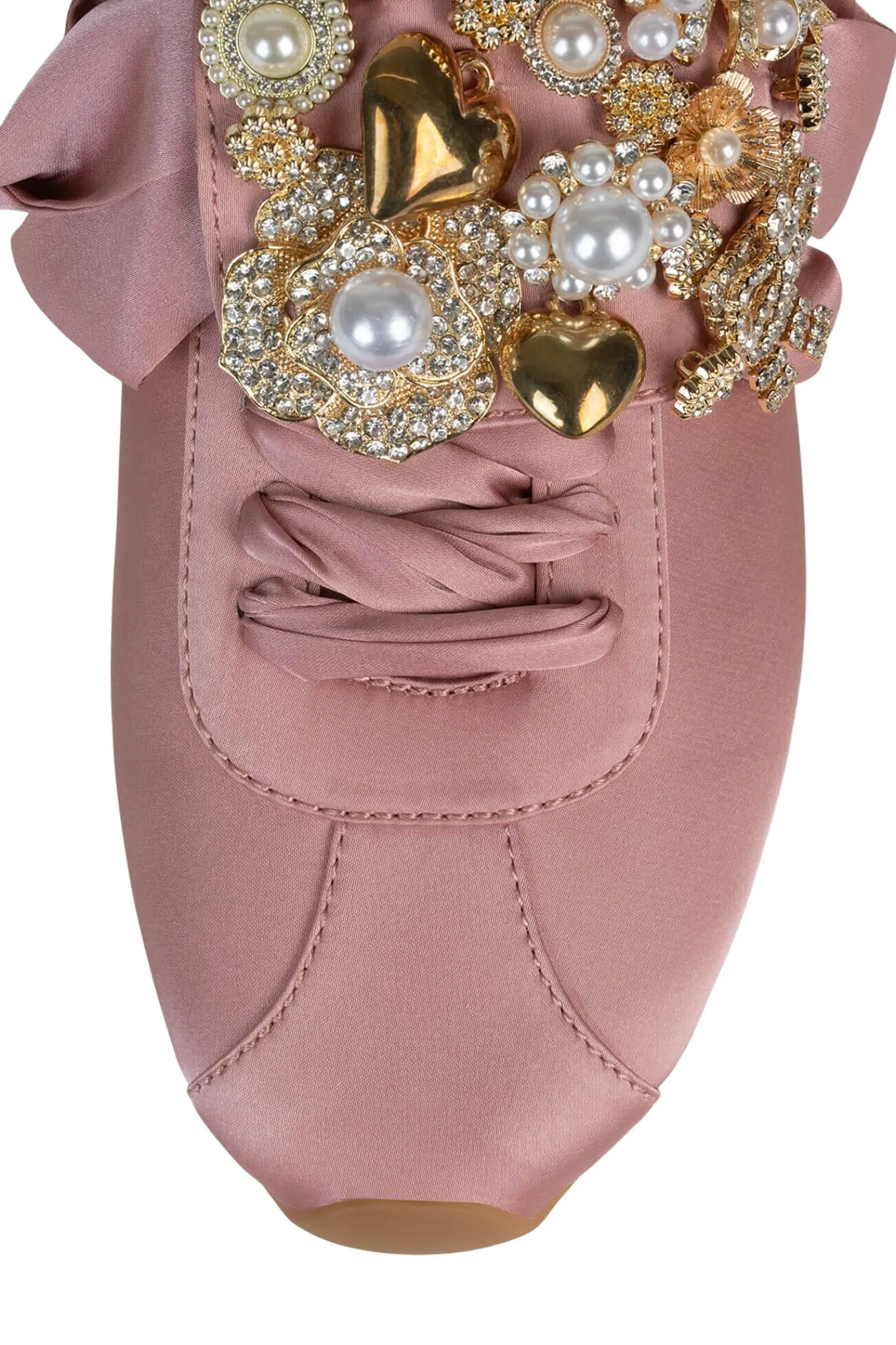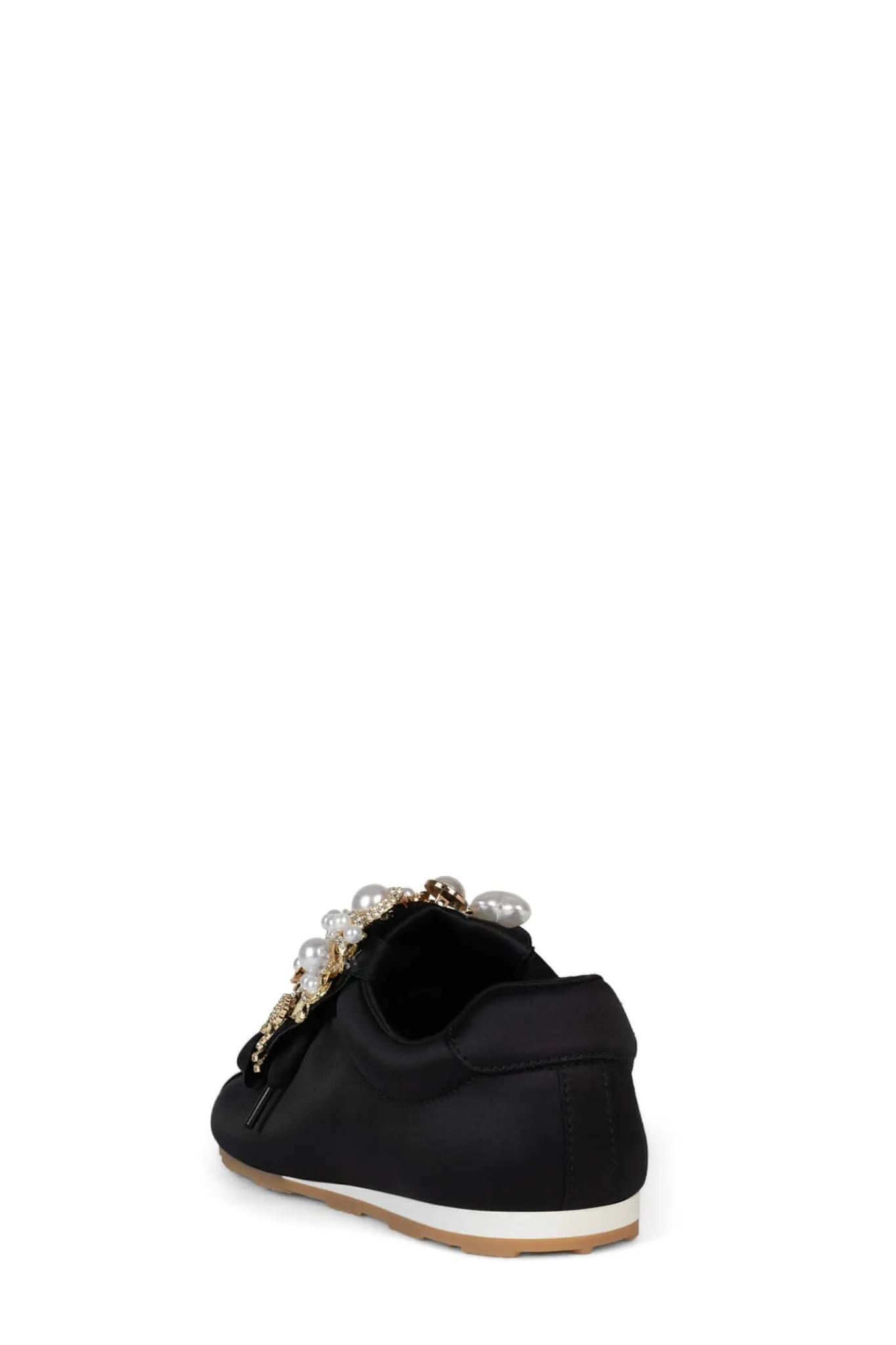 Satin sneaker with embellished fold-over tongue.