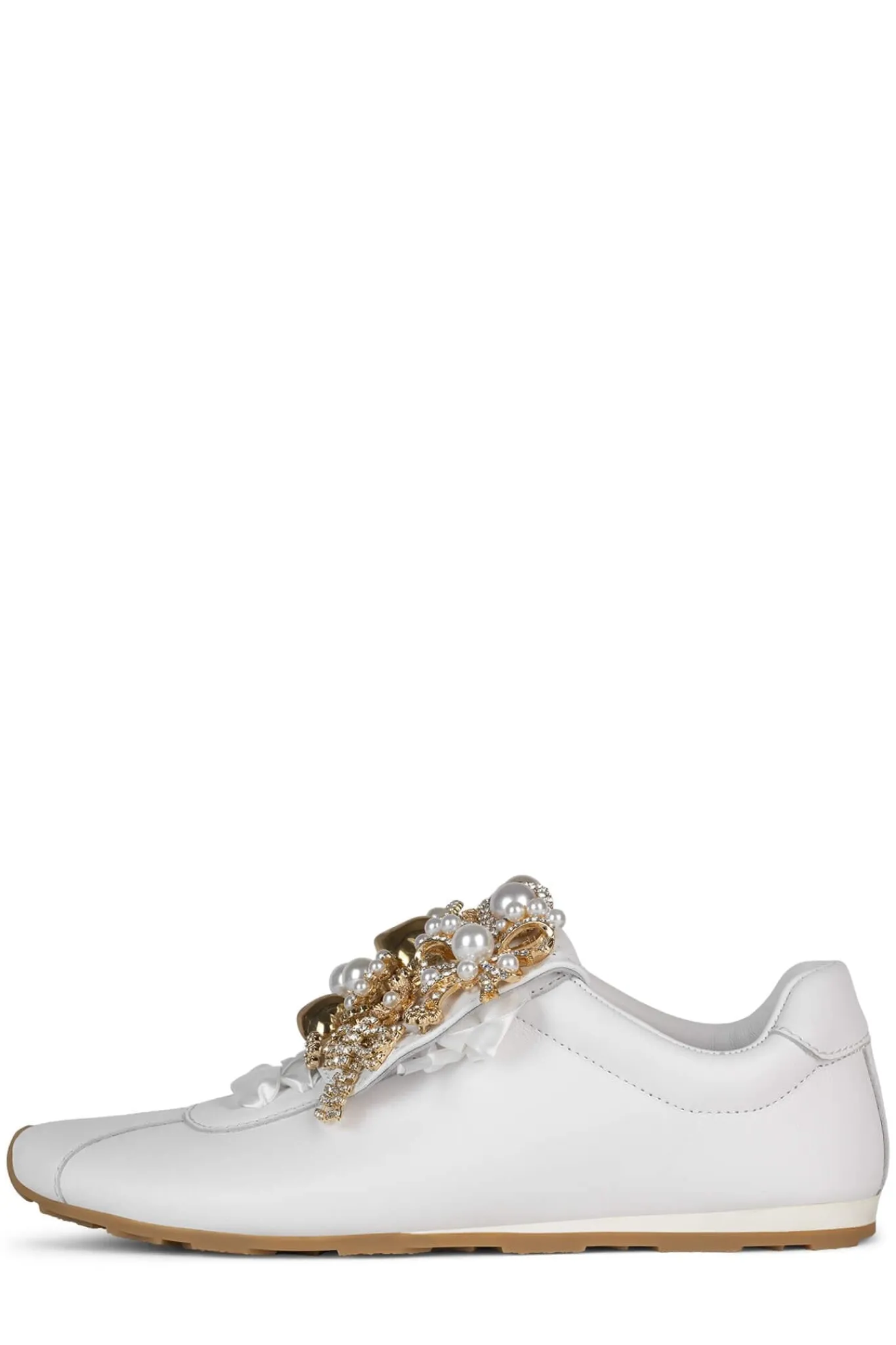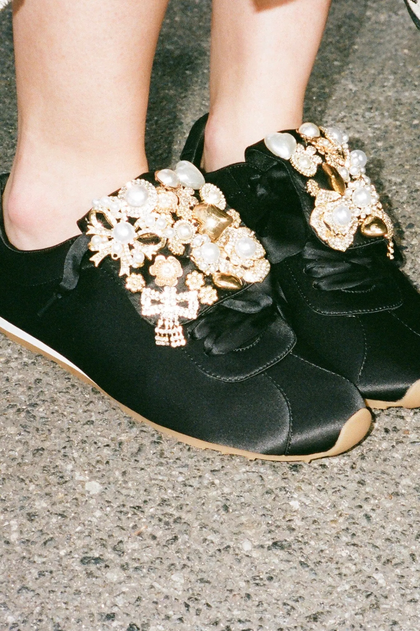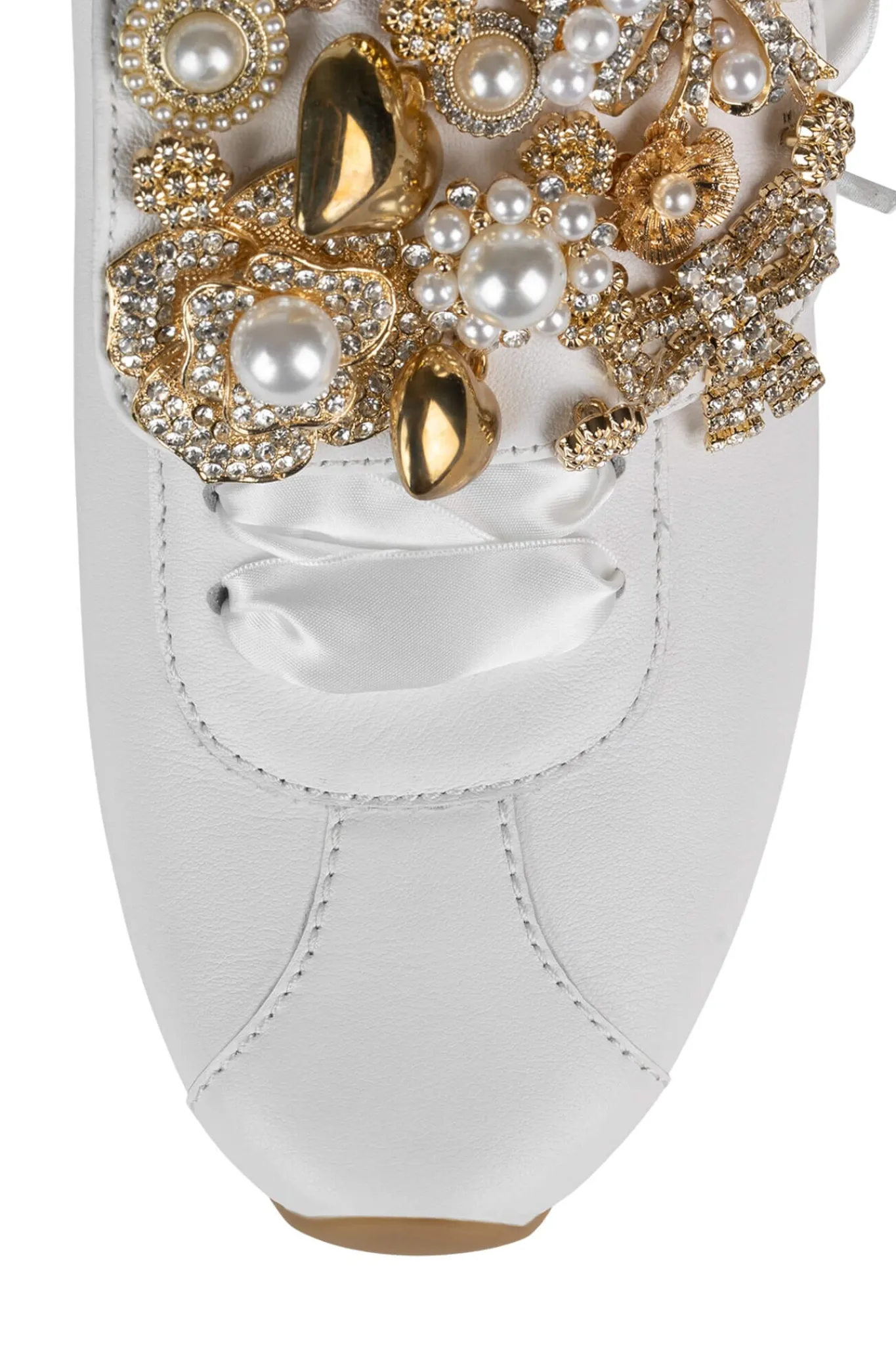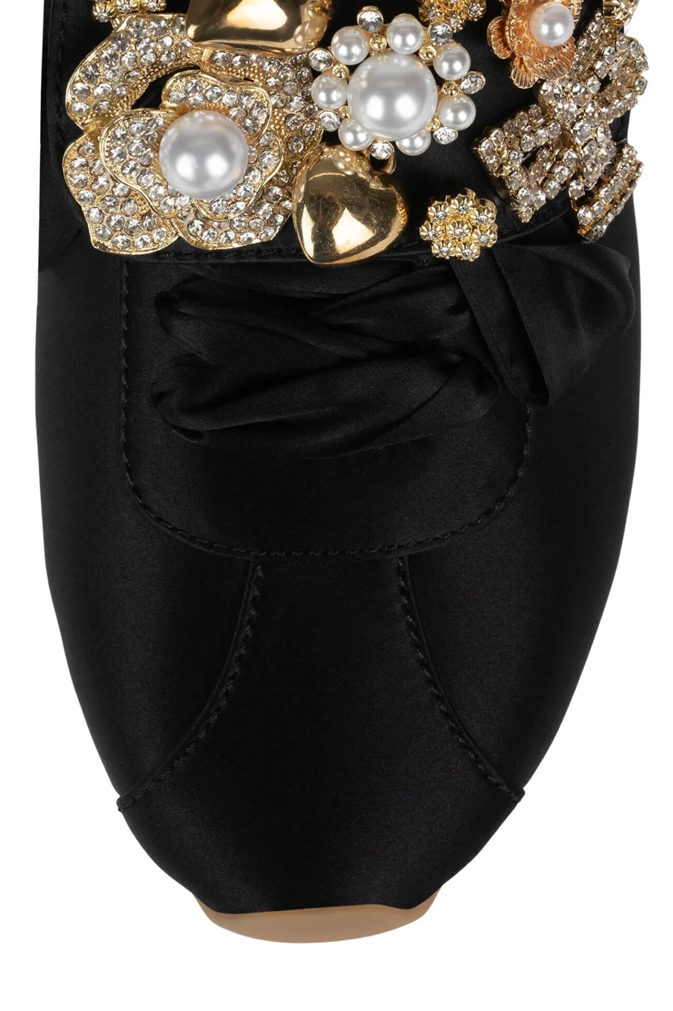 Satin sneaker with embellished fold-over tongue.